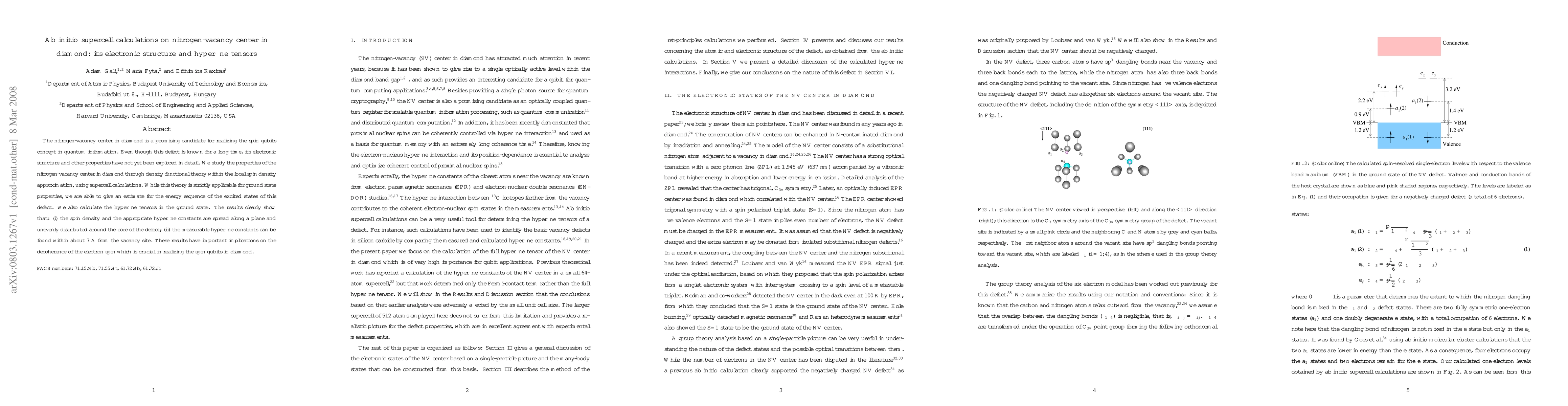 This paper uses density functional theory to explore the electronic structure and hyperfine tensors of nitrogen-vacancy centers in diamond, revealing uneven spin density distribution and hyperfine constants within 7 Å from the defect site, which are crucial for spin qubit applications.