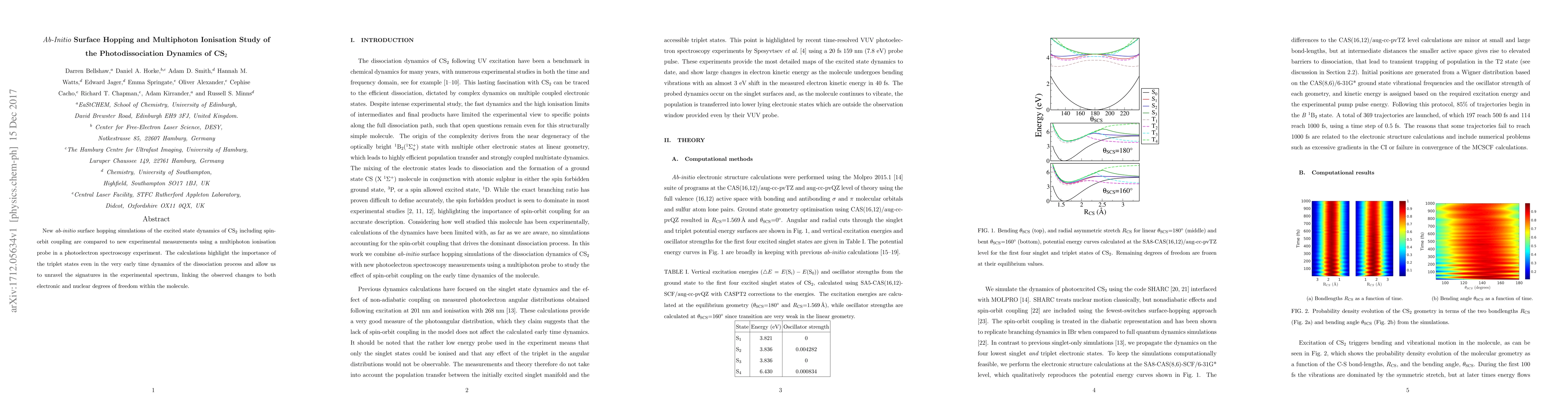 New ab-initio surface hopping simulations of the excited state dynamics of CS$_2$ including spin-orbit coupling are compared to new experimental measurements using a multiphoton ionisation probe in a photoelectron spectroscopy experiment. The calculations highlight the importance of the triplet states even in the very early time dynamics of the dissociation process and allow us to unravel the signatures in the experimental spectrum, linking the observed changes to both electronic and nuclear degrees of freedom within the molecule.
