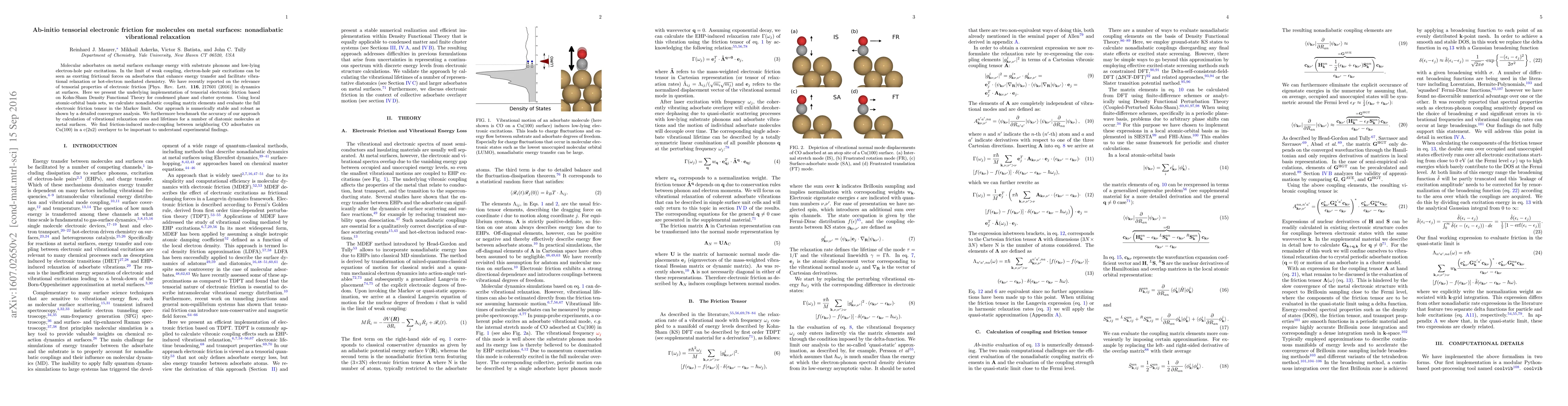 This paper presents an ab-initio method for calculating tensorial electronic friction based on Kohn-Sham Density Functional Theory, which is used to model nonadiabatic vibrational relaxation in molecular adsorbates on metal surfaces. The method demonstrates numerical stability and accuracy, as evidenced by benchmarking against experimental findings on CO adsorbates on Cu(100).