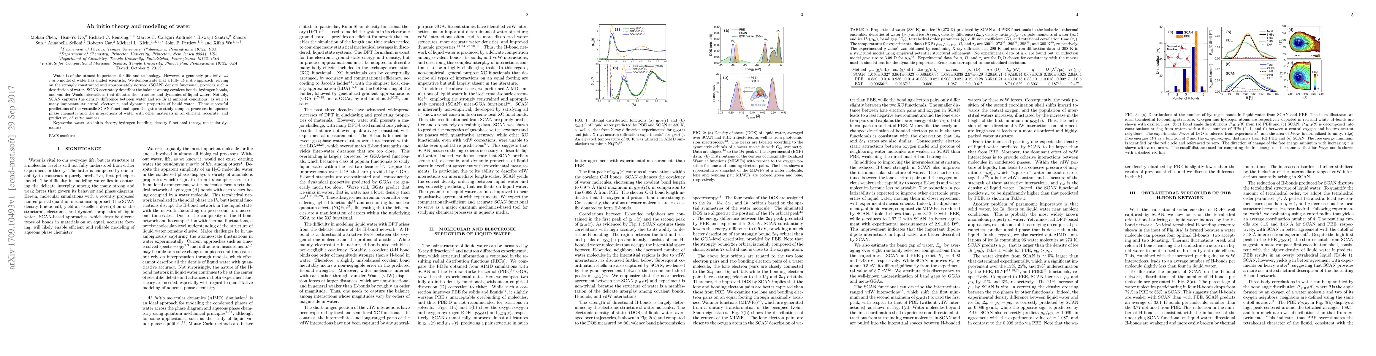 This paper presents an ab initio model of water using the SCAN density functional, accurately describing the balance of covalent, hydrogen, and van der Waals interactions in liquid water and capturing the density difference between water and ice I{\it h}. This model enables efficient, accurate, and predictive studies of aqueous phase chemistry and water interactions with other materials.