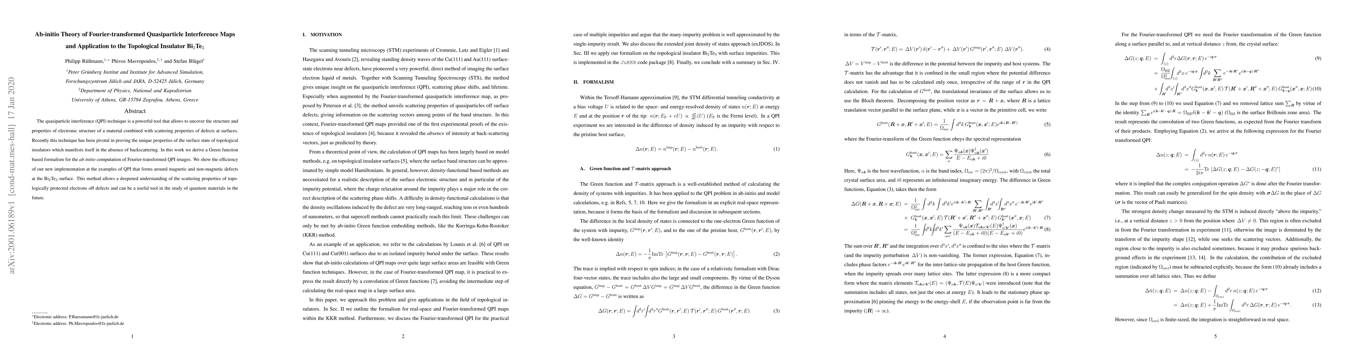 The quasiparticle interference (QPI) technique is a powerful tool that allows to uncover the structure and properties of electronic structure of a material combined with scattering properties of defects at surfaces. Recently this technique has been pivotal in proving the unique properties of the surface state of topological insulators which manifests itself in the absence of backscattering. In this work we derive a Green function based formalism for the ab initio computation of Fourier-transformed QPI images. We show the efficiency of our new implementation at the examples of QPI that forms around magnetic and non-magnetic defects at the Bi$_2$Te$_3$ surface. This method allows a deepened understanding of the scattering properties of topologically protected electrons off defects and can be a useful tool in the study of quantum materials in the future.