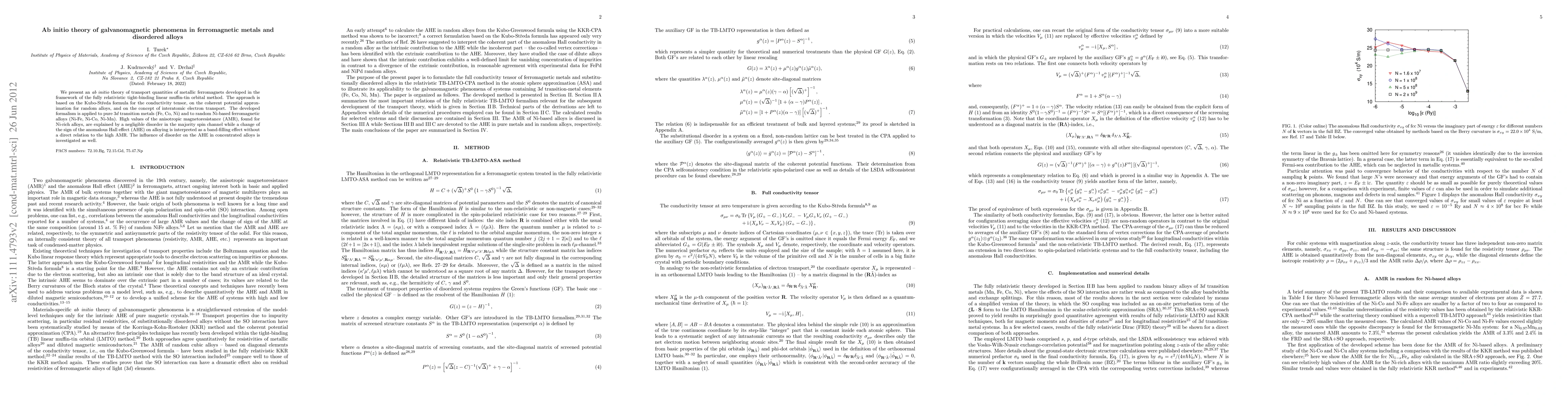 This paper develops an ab initio theory for galvanomagnetic phenomena in ferromagnetic metals using relativistic tight-binding methods, focusing on anisotropic magnetoresistance and anomalous Hall effect in pure 3d transition metals and Ni-based alloys. High AMR in Ni-rich alloys is attributed to minimal disorder in the majority spin channel, while changes in the AHE are linked to band-filling effects.