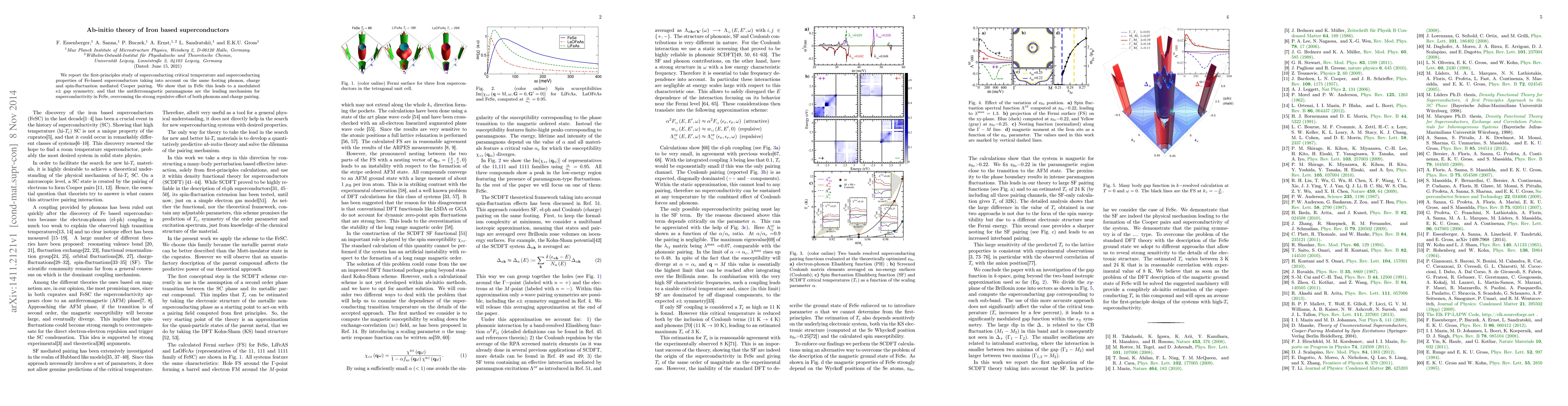 We report the first-principles study of superconducting critical temperature and superconducting properties of Fe-based superconductors taking into account on the same footing phonon, charge and spin-fluctuation mediated Cooper pairing. We show that in FeSe this leads to a modulated s$\pm$ gap symmetry, and that the antiferromagnetic paramagnons are the leading mechanism for superconductivity in FeSe, overcoming the strong repulsive effect of both phonons and charge pairing.