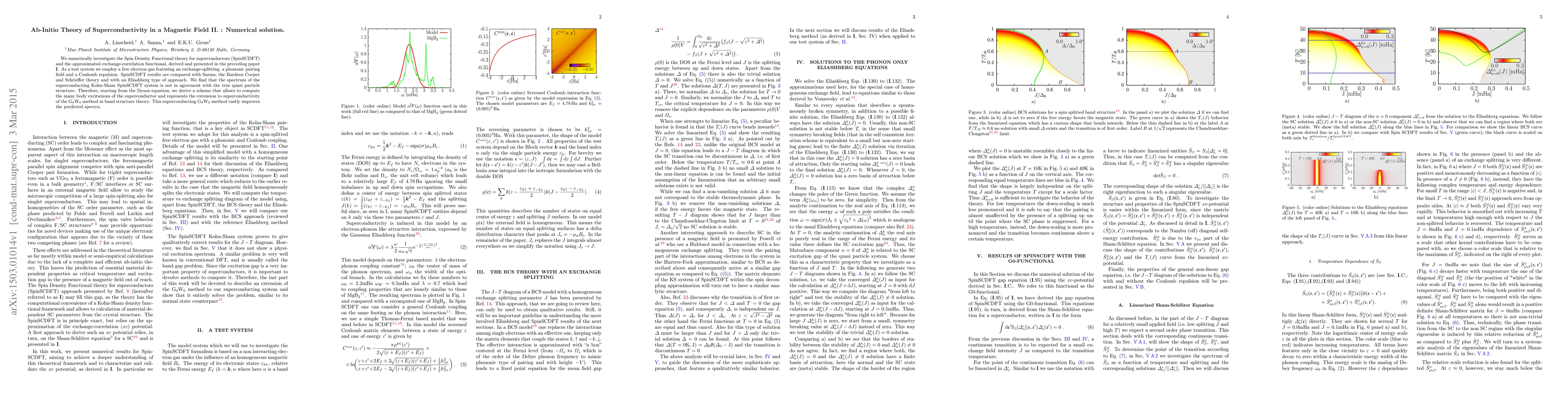 We numerically investigate the Spin Density Functional theory for superconductors (SpinSCDFT) and the approximated exchange-correlation functional, derived and presented in the preceding paper I. As a test system we employ a free electron gas featuring an exchange-splitting, a phononic pairing field and a Coulomb repulsion. SpinSCDFT results are compared with Sarma, the Bardeen Cooper and Schrieffer theory and with an Eliashberg type of approach. We find that the spectrum of the superconducting Kohn-Sham SpinSCDFT system is not in agreement with the true quasi particle structure. Therefore, starting from the Dyson equation, we derive a scheme that allows to compute the many body excitations of the superconductor and represents the extension to superconductivity of the G0W0 method in band structure theory. This superconducting G0 W0 method vastly improves the predicted spectra.