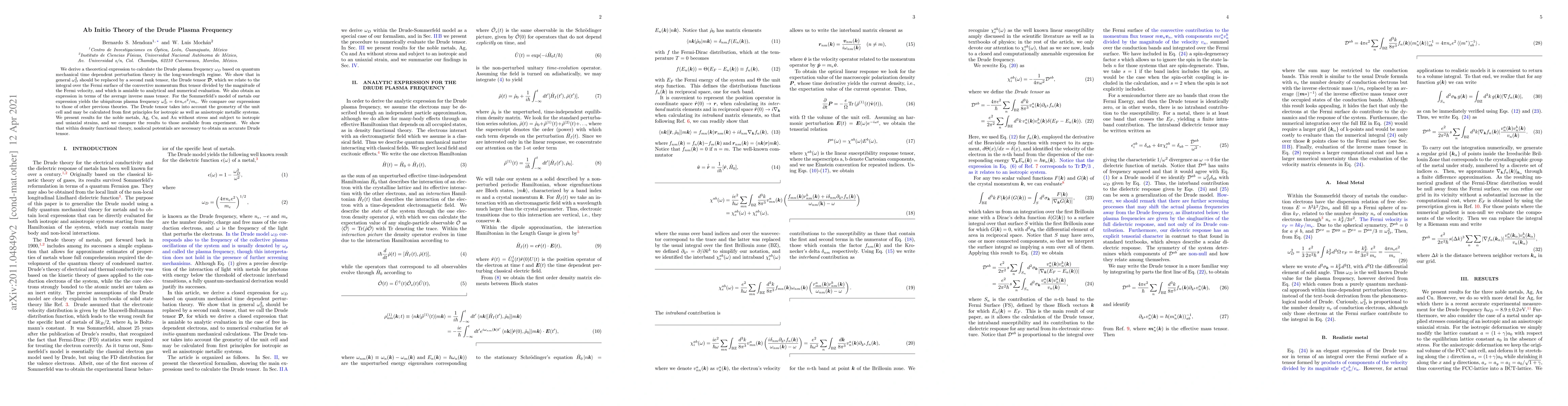 We derive a theoretical expression to calculate the Drude plasma frequency $\omega_p$ based on quantum mechanical time dependent perturbation theory. We show that in general $\omega_p^2$ should be replaced by a second rank tensor, the Drude tensor $\mathcal{D}$, which we express in terms of products of the velocity expectation values integrated over the Fermi surface, and which is amiable to analytical and numerical evaluation. For the Sommerfeld's model of metals our expression yields the ubiquitous plasma frequency $\omega^2_p=4\pi n_e e^2/m_e$. The Drude tensor takes into account the geometry of the unit cell and may be calculated from first principles for isotropic as well as anisotropic metallic systems. We present results for the noble metals, Cu, Ag, and Au without stress and subject to isotropic and uniaxial strains, and we compare the results to those available from experiment.