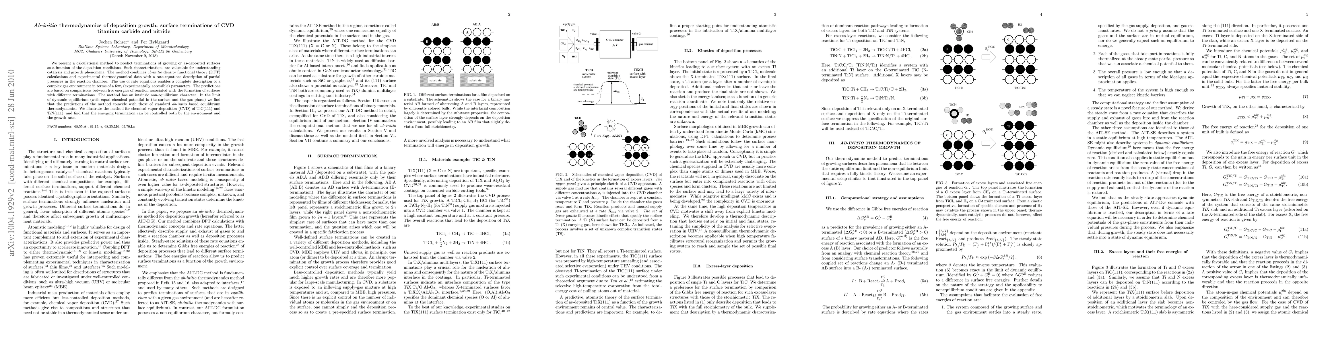 This paper proposes a method combining ab-initio DFT calculations and experimental thermodynamic data to predict surface terminations during CVD growth of titanium carbide and nitride. The method uses rate equations to describe complex gas environments and predicts surface terminations based on free energy comparisons, showing control over terminations via environmental and growth rate factors.