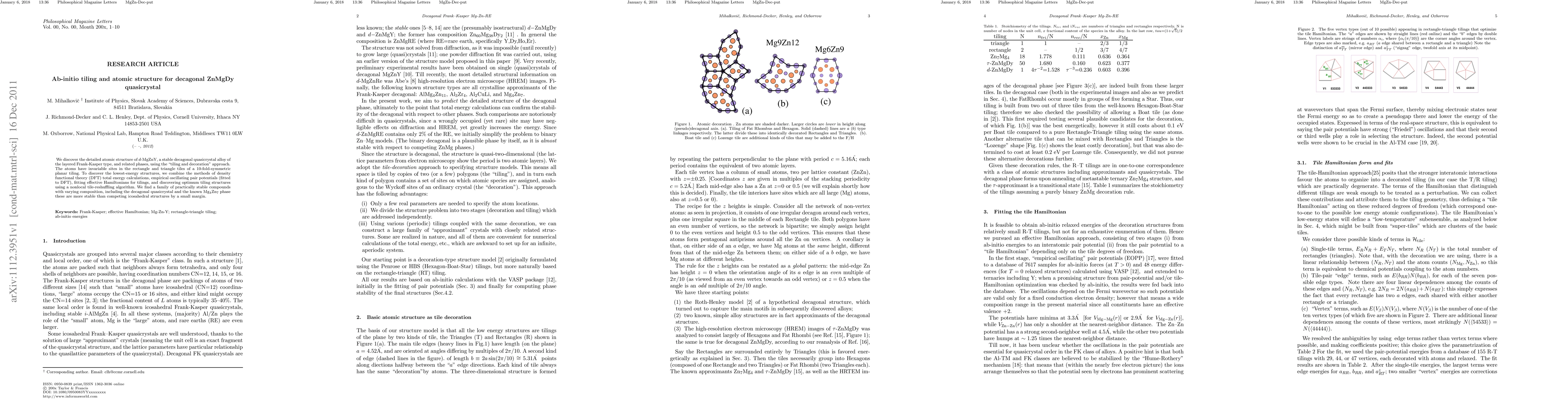 This paper presents an ab-initio investigation into the atomic structure of the decagonal ZnMgDy quasicrystal using a tiling and decoration method, revealing stable compounds with fixed atomic sites within rectangle and triangle tiles. The study combines density functional theory and empirical potentials to identify the most stable configurations, finding a family of stable phases including the decagonal quasicrystal and Mg$_4$Zn$_7$.