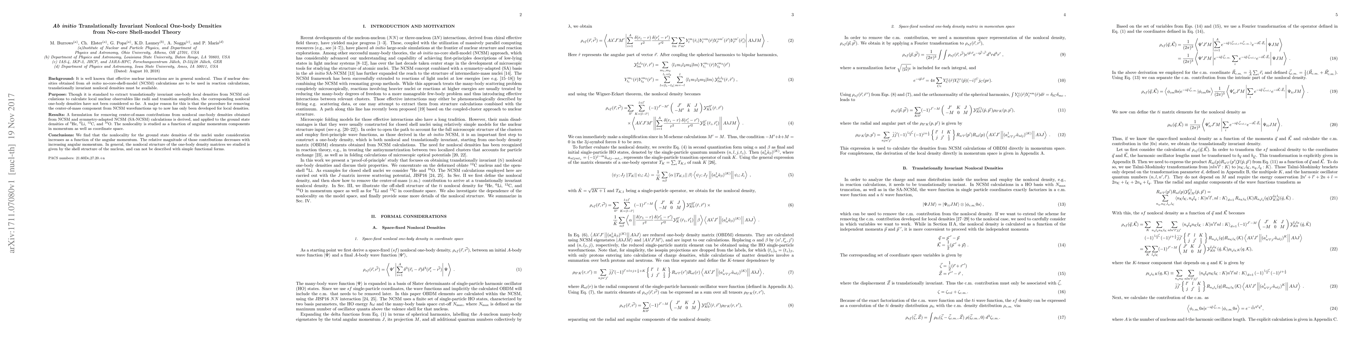 [Background:] It is well known that effective nuclear interactions are in general nonlocal. Thus if nuclear densities obtained from {\it ab initio} no-core-shell-model (NCSM) calculations are to be used in reaction calculations, translationally invariant nonlocal densities must be available. [Purpose:] Though it is standard to extract translationally invariant one-body local densities from NCSM calculations to calculate local nuclear observables like radii and transition amplitudes, the corresponding nonlocal one-body densities have not been considered so far. A major reason for this is that the procedure for removing the center-of-mass component from NCSM wavefunctions up to now has only been developed for local densities. [Results:] A formulation for removing center-of-mass contributions from nonlocal one-body densities obtained from NCSM and symmetry-adapted NCSM (SA-NCSM) calculations is derived, and applied to the ground state densities of $^4$He, $^6$Li, $^{12}$C, and $^{16}$O. The nonlocality is studied as a function of angular momentum components in momentum as well as coordinate space [Conclusions:] We find that the nonlocality for the ground state densities of the nuclei under consideration increases as a function of the angular momentum. The relative magnitude of those contributions decreases with increasing angular momentum. In general, the nonlocal structure of the one-body density matrices we studied is given by the shell structure of the nucleus, and can not be described with simple functional forms.