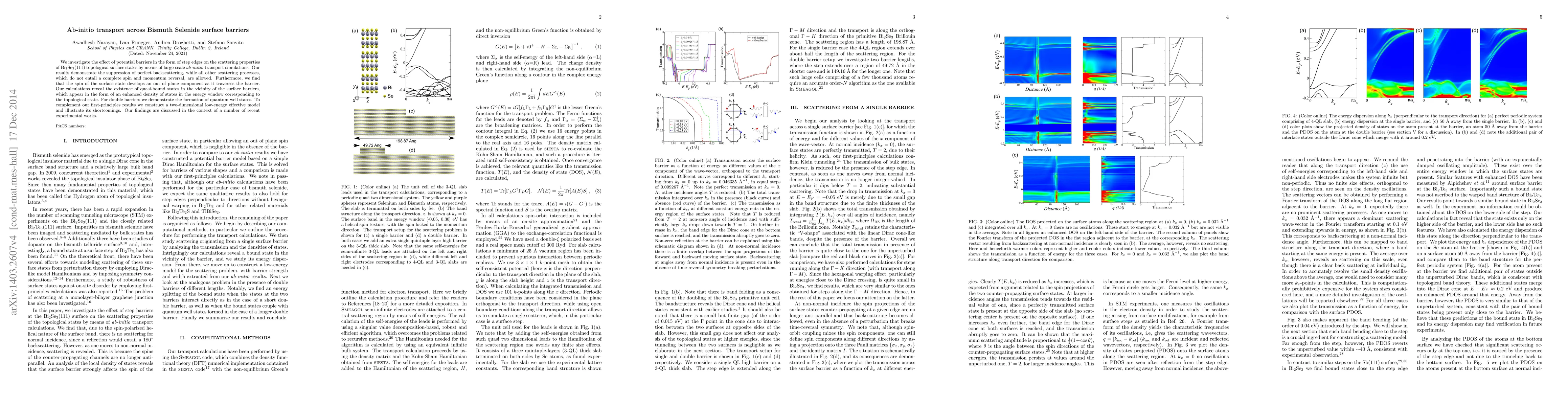 Researchers used ab-initio transport simulations to study how topological surface states on Bismuth Selenide interact with step edges, finding that perfect backscattering is suppressed and spin develops an out-of-plane component as it crosses barriers.