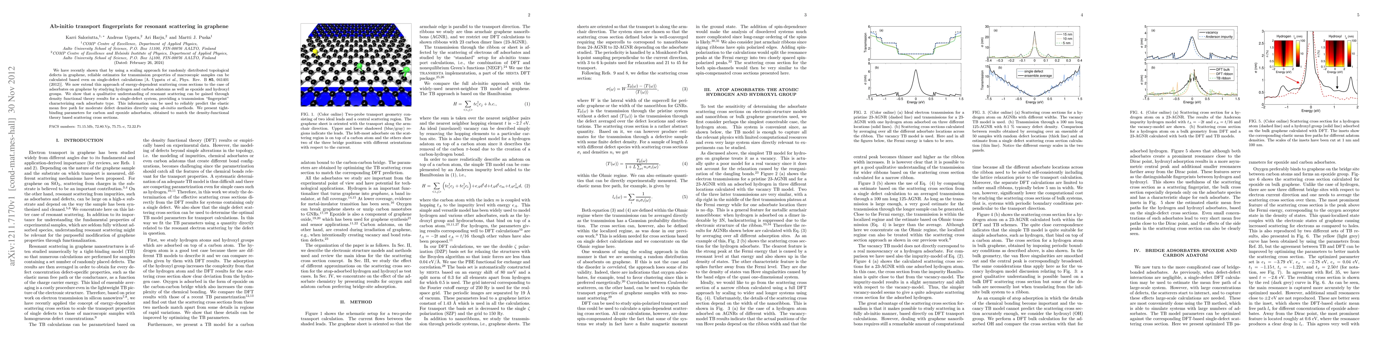 We have recently shown that by using a scaling approach for randomly distributed topological defects in graphene, reliable estimates for transmission properties of macroscopic samples can be calculated based even on single-defect calculations [A. Uppstu et al., Phys. Rev. B 85, 041401 (2012)]. We now extend this approach of energy-dependent scattering cross sections to the case of adsorbates on graphene by studying hydrogen and carbon adatoms as well as epoxide and hydroxyl groups. We show that a qualitative understanding of resonant scattering can be gained through density functional theory results for a single-defect system, providing a transmission "fingerprint" characterizing each adsorbate type. This information can be used to reliably predict the elastic mean free path for moderate defect densities directly using ab-initio methods. We present tight-binding parameters for carbon and epoxide adsorbates, obtained to match the density-functional theory based scattering cross sections.