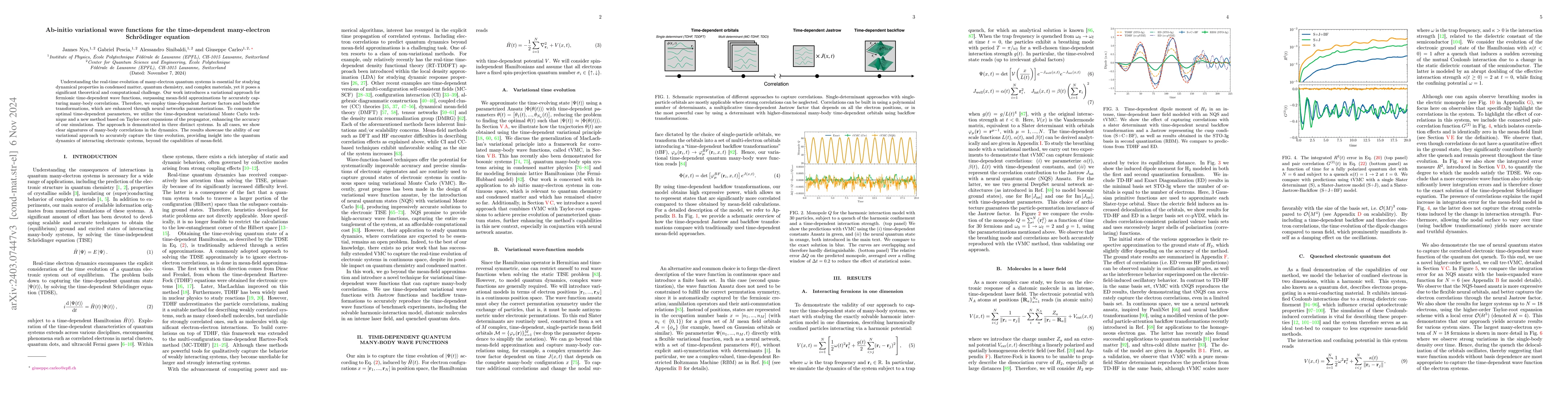 The novelty lies in the comprehensive approach that combines variational principles with advanced machine learning techniques to accurately model and simulate the time evolution of many-electron quantum systems, capturing many-body correlations beyond mean-field approximations.