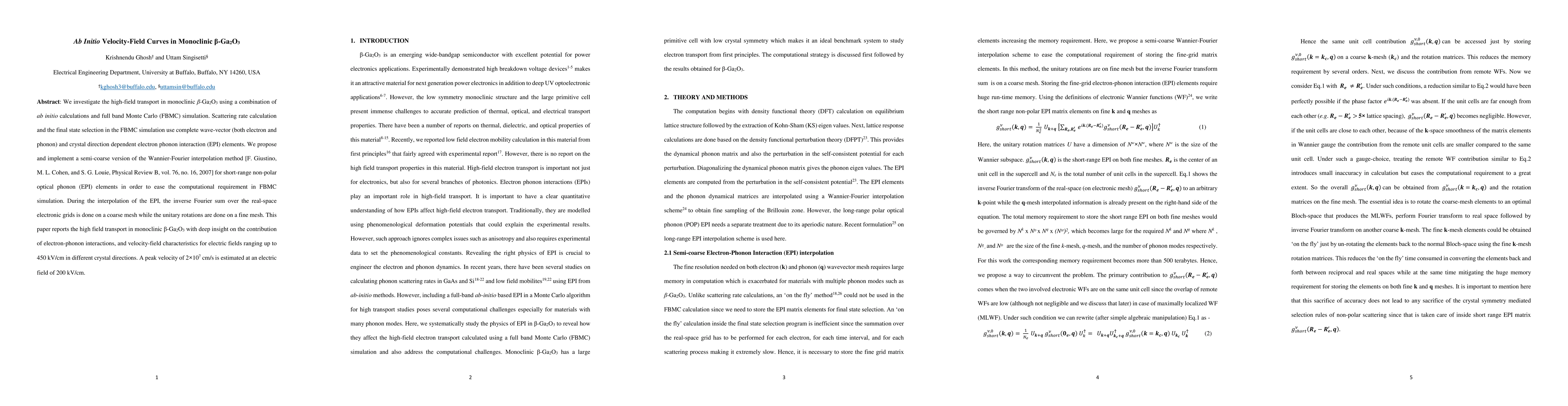 This paper investigates high-field transport in monoclinic \(\beta\)-Ga\(_2\)O\(_3\) using ab initio calculations and full band Monte Carlo simulations, focusing on electron-phonon interactions and velocity-field characteristics. A semi-coarse Wannier-Fourier interpolation method is implemented to manage computational demands, revealing a peak velocity of \(2 \times 10^7\) cm/s at 200 kV/cm.