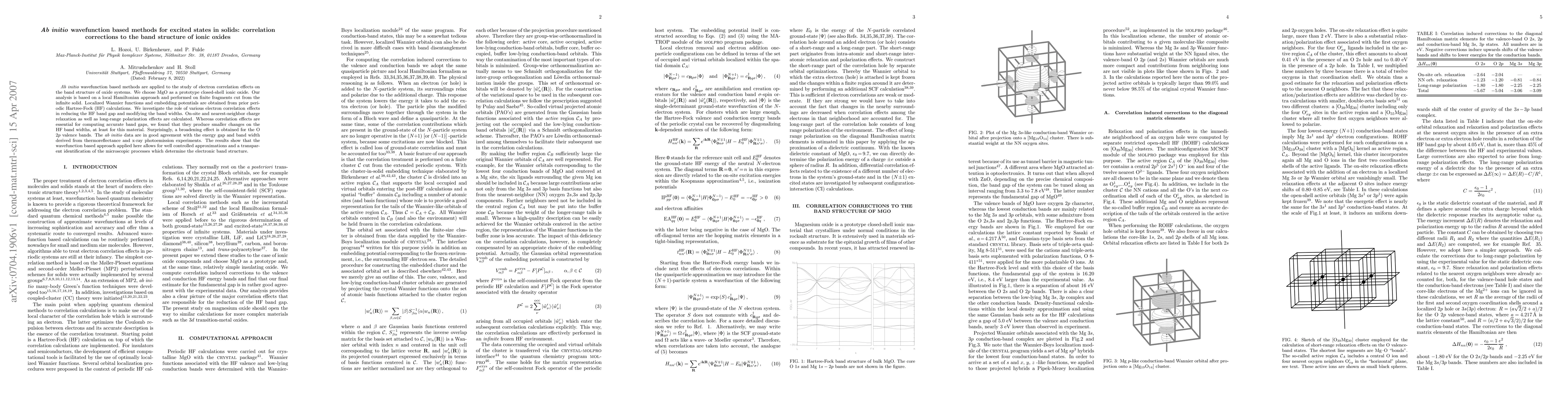 Ab initio wavefunction based methods are applied to the study of electron correlation effects on the band structure of oxide systems. We choose MgO as a prototype closed-shell ionic oxide. Our analysis is based on a local Hamiltonian approach and performed on finite fragments cut from the infinite solid. Localized Wannier functions and embedding potentials are obtained from prior periodic Hartree-Fock (HF) calculations. We investigate the role of various electron correlation effects in reducing the HF band gap and modifying the band widths. On-site and nearest-neighbor charge relaxation as well as long-range polarization effects are calculated. Whereas correlation effects are essential for computing accurate band gaps, we found that they produce smaller changes on the HF band widths, at least for this material. Surprisingly, a broadening effect is obtained for the O 2p valence bands. The ab initio data are in good agreement with the energy gap and band width derived from thermoreflectance and x-ray photoemission experiments. The results show that the wavefunction based approach applied here allows for well controlled approximations and a transparent identification of the microscopic processes which determine the electronic band structure.