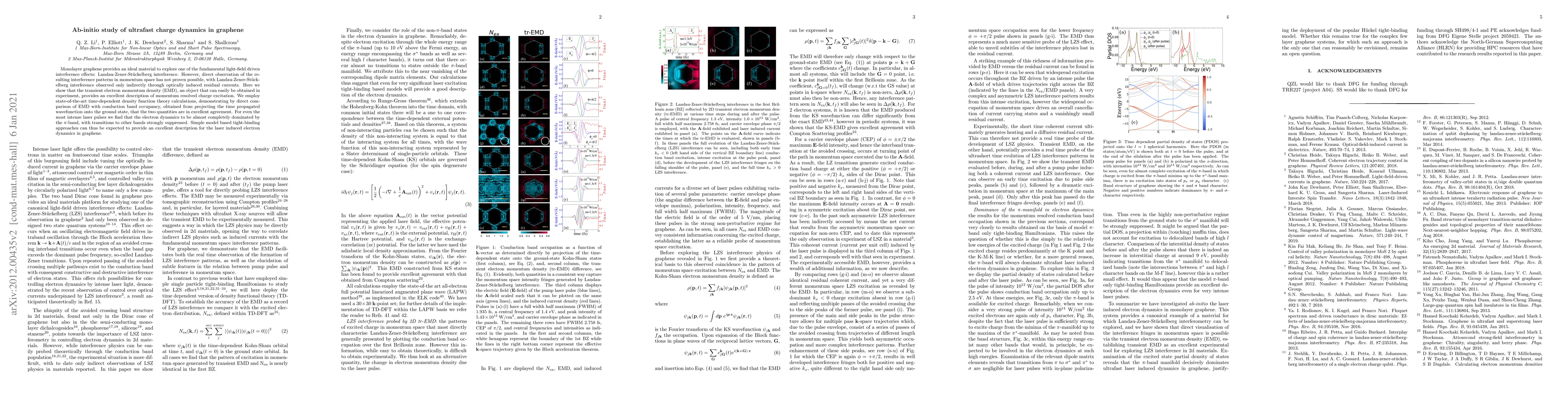 Monolayer graphene provides an ideal material to explore one of the fundamental light-field driven interference effects: Landau-Zener-St\"uckelberg interference. However, direct observation of the resulting interference patterns in momentum space has not proven possible, with Landau-Zener-St\"uckelberg interference observed only indirectly through optically induced residual currents. Here we show that the transient electron momentum density (EMD), an object that can easily be obtained in experiment, provides an excellent description of momentum resolved charge excitation. We employ state-of-the-art time-dependent density function theory calculations, demonstrating by direct comparison of EMD with conduction band occupancy, obtained from projecting the time propagated wavefunction onto the ground state, that the two quantities are in excellent agreement. For even the most intense laser pulses we find that the electron dynamics to be almost completely dominated by the $\pi$-band, with transitions to other bands strongly suppressed. Simple model based tight-binding approaches can thus be expected to provide an excellent description for the laser induced electron dynamics in graphene.