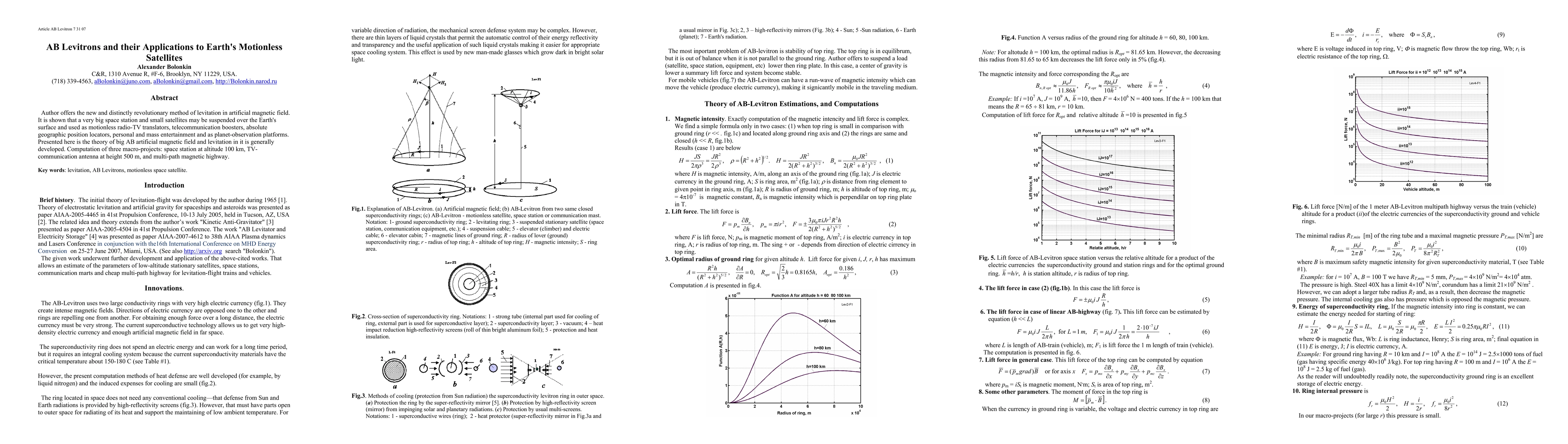 Author offers the new and distinctly revolutionary method of levitation in artificial magnetic field. It is shown that a very big space station and small satellites may be suspended over the Earth's surface and used as motionless radio-TV translators, telecommunication boosters, absolute geographic position locators, personal and mass entertainment and as planet-observation platforms. Presented here is the theory of big AB artificial magnetic field and levitation in it is generally developed. Computation of three macro-projects: space station at altitude 100 km, TV-communication antenna at height 500 m, and multi-path magnetic highway. Key words: levitation, AB Levitrons, motionless space satellite.