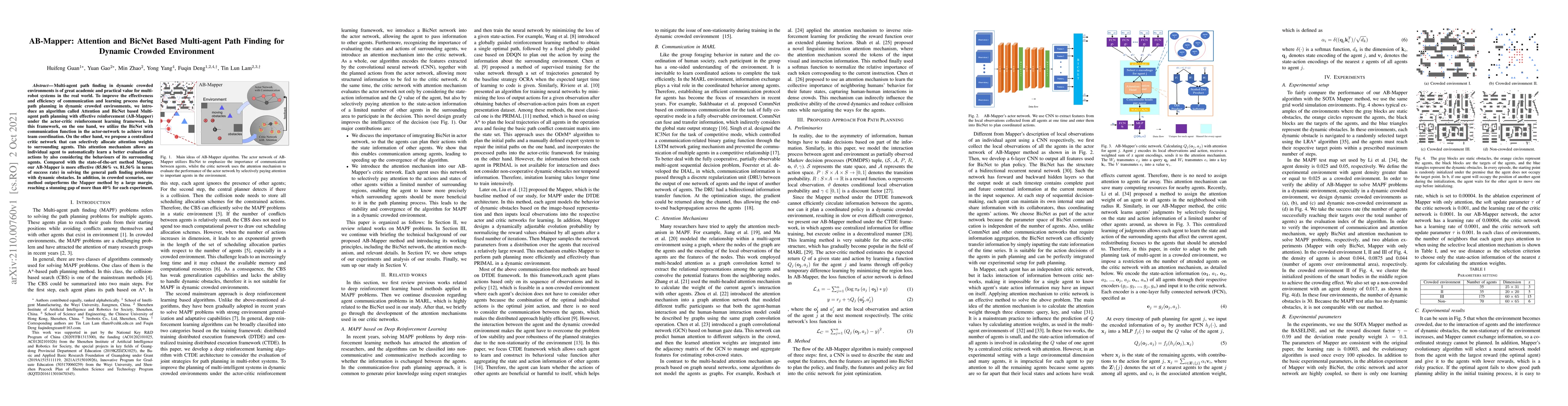 AB-Mapper, an actor-critic reinforcement learning algorithm incorporating BicNet and attention mechanisms, enhances multi-agent path finding in dynamic crowded environments. It significantly outperforms the Mapper method, achieving an 85.86% success rate compared to 81.56%, especially excelling in crowded scenarios by over 40%.