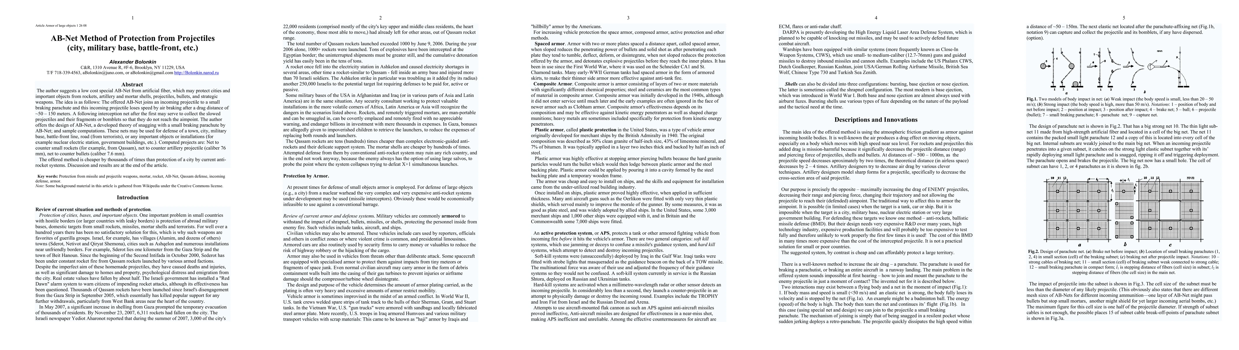 The paper proposes a low-cost AB-Net defense system made from artificial fiber to protect cities and military installations from various projectiles. The method involves attaching a small braking parachute to incoming projectiles, slowing them down over a drag distance before a secondary interception net collects them, significantly reducing costs compared to existing anti-rocket systems.