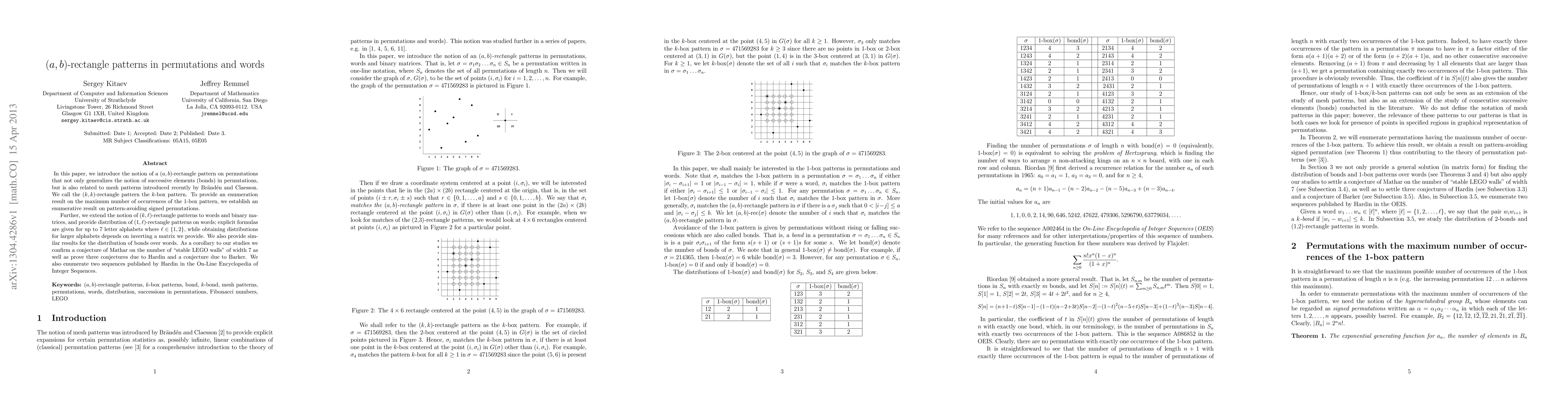 In this paper, we introduce the notion of a $(a,b)$-rectangle pattern on permutations that not only generalizes the notion of successive elements (bonds) in permutations, but is also related to mesh patterns introduced recently by Br\"and\'en and Claesson. We call the $(k,k)$-rectangle pattern the $k$-box pattern. To provide an enumeration result on the maximum number of occurrences of the 1-box pattern, we establish an enumerative result on pattern-avoiding signed permutations. Further, we extend the notion of $(k,\ell)$-rectangle patterns to words and binary matrices, and provide distribution of $(1,\ell)$-rectangle patterns on words; explicit formulas are given for up to 7 letter alphabets where $\ell \in \{1,2\}$, while obtaining distributions for larger alphabets depends on inverting a matrix we provide. We also provide similar results for the distribution of bonds over words. As a corollary to our studies we confirm a conjecture of Mathar on the number of "stable LEGO walls" of width 7 as well as prove three conjectures due to Hardin and a conjecture due to Barker. We also enumerate two sequences published by Hardin in the On-Line Encyclopedia of Integer Sequences.