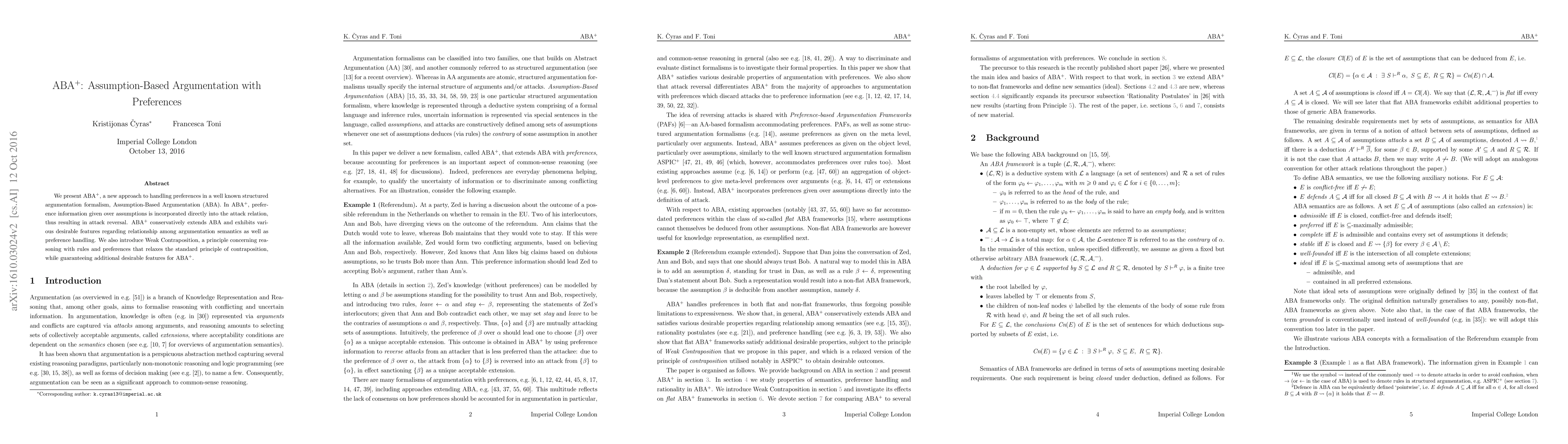 Title: ABA+: Assumption-Based Argumentation with Preferences Summary: ABA+ extends the Assumption-Based Argumentation (ABA) formalism by incorporating preference information into the attack relation to enable attack reversal, while maintaining desirable semantic properties and introducing the Weak Contraposition principle for enhanced reasoning.