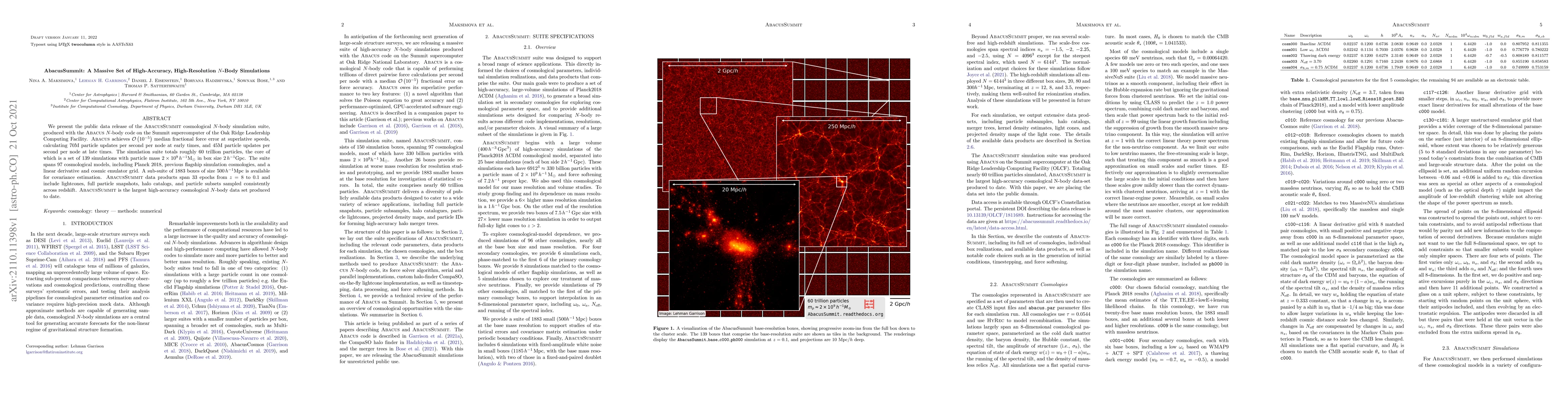 The AbacusSummit simulation suite, released publicly, consists of high-accuracy, high-resolution $N$-body simulations on the Summit supercomputer, featuring 60 trillion particles across 139 simulations. The $\texttt{Abacus}$ code achieves exceptional speed and precision, making it the largest cosmological $N$-body dataset available to date.