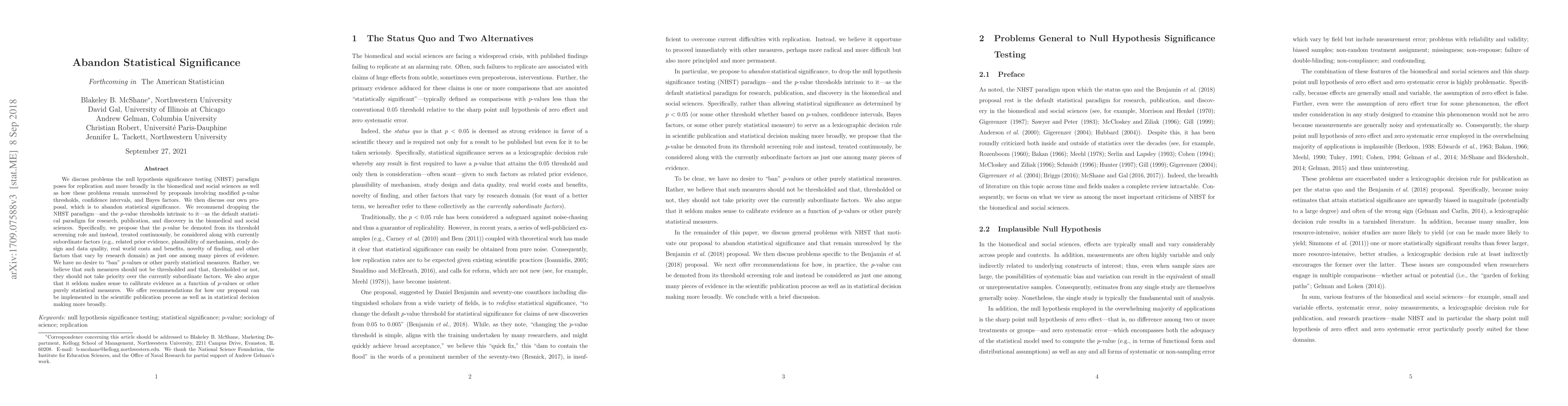This paper critiques the null hypothesis significance testing (NHST) paradigm, arguing that it leads to unresolved issues in replication and broader scientific integrity. The authors propose abandoning statistical significance and treating the p-value as one of many evidence factors rather than a threshold, advocating for a more holistic approach to scientific evaluation.