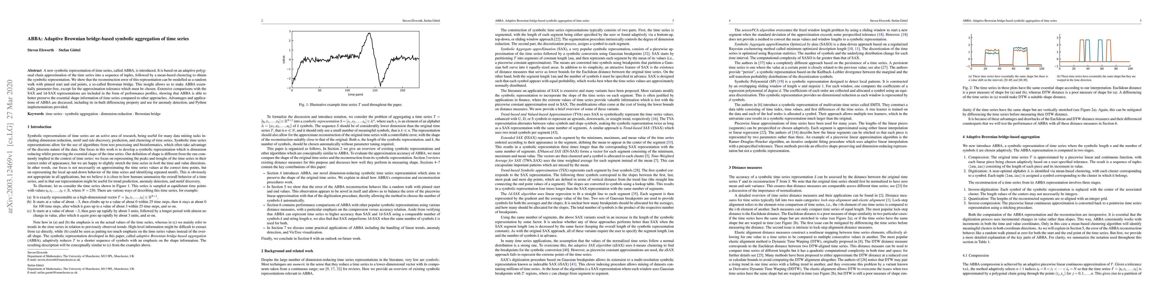 ABBA is an adaptive symbolic aggregation method for time series that converts them into a sequence of tuples via polygonal chain approximation and mean-based clustering. It leverages a Brownian bridge model to minimize reconstruction error, making it largely parameter-free, and demonstrates superior shape preservation compared to SAX and 1d-SAX.