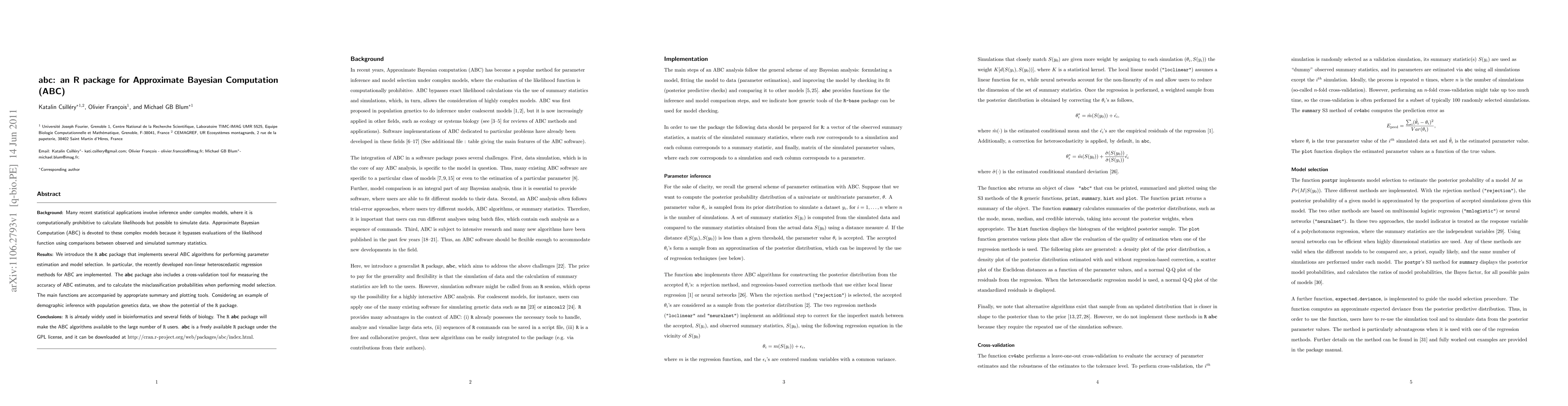 The R package "abc" implements Approximate Bayesian Computation (ABC) algorithms for parameter estimation and model selection, particularly focusing on non-linear heteroscedastic regression methods. It includes tools for assessing the accuracy of estimates and is freely available under the GPL license.