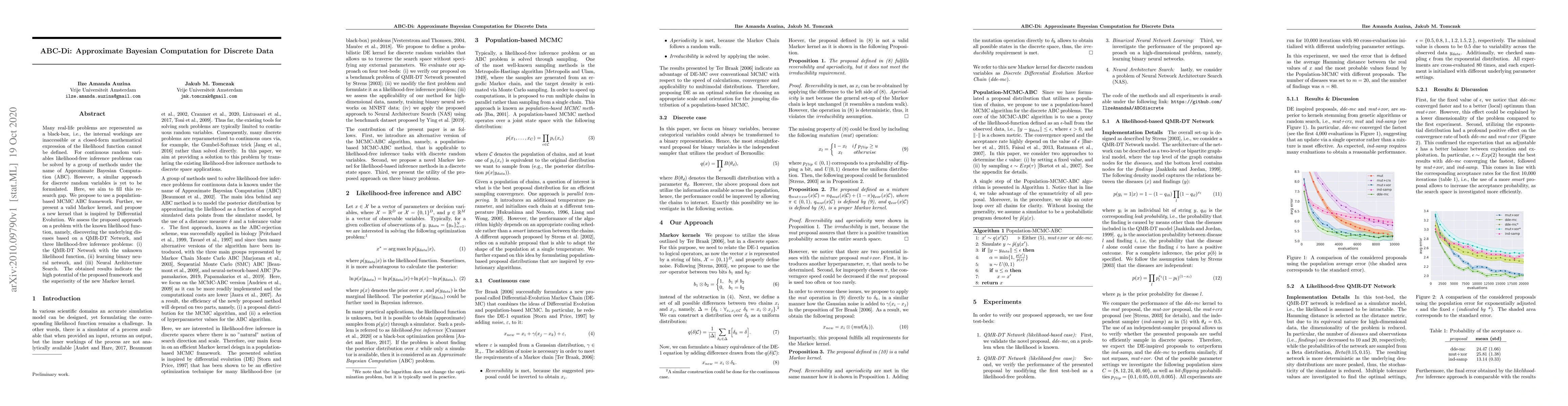 This paper introduces ABC-Di, an Approximate Bayesian Computation (ABC) framework for discrete data, addressing the lack of similar methods for such data. The proposed population-based MCMC ABC approach, along with a new Differential Evolution-inspired kernel, shows promising results in various likelihood-free inference problems, including neural network learning and architecture search.