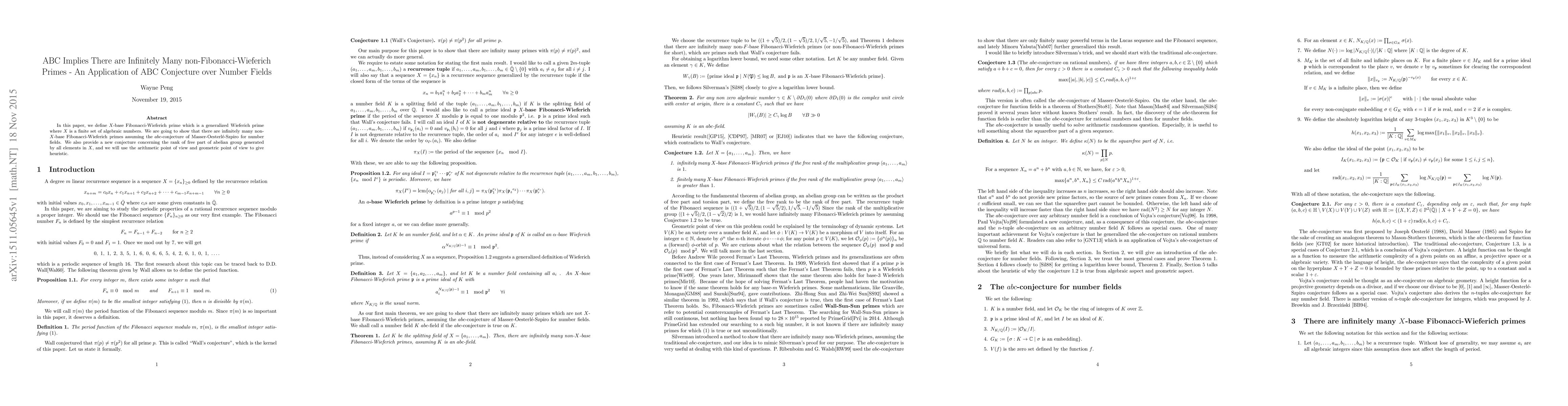 This paper proves the existence of infinitely many non-$X$-base Fibonacci-Wieferich primes under the assumption of the ABC conjecture for number fields, introducing a generalized notion of Fibonacci-Wieferich primes based on a set of algebraic numbers. It also proposes a new conjecture regarding the rank of the free part of an abelian group generated by elements in $X$.