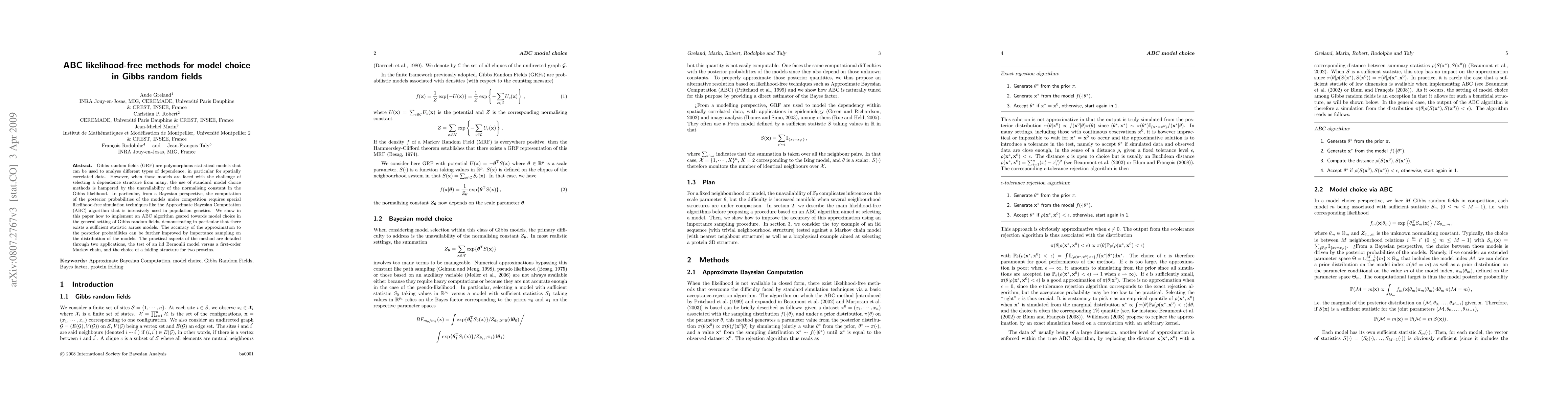 This paper proposes an Approximate Bayesian Computation (ABC) method for model selection in Gibbs random fields, addressing the challenge of unavailable normalizing constants. It demonstrates the implementation of an ABC algorithm for this purpose, showing the existence of a sufficient statistic across models and improving accuracy through importance sampling.