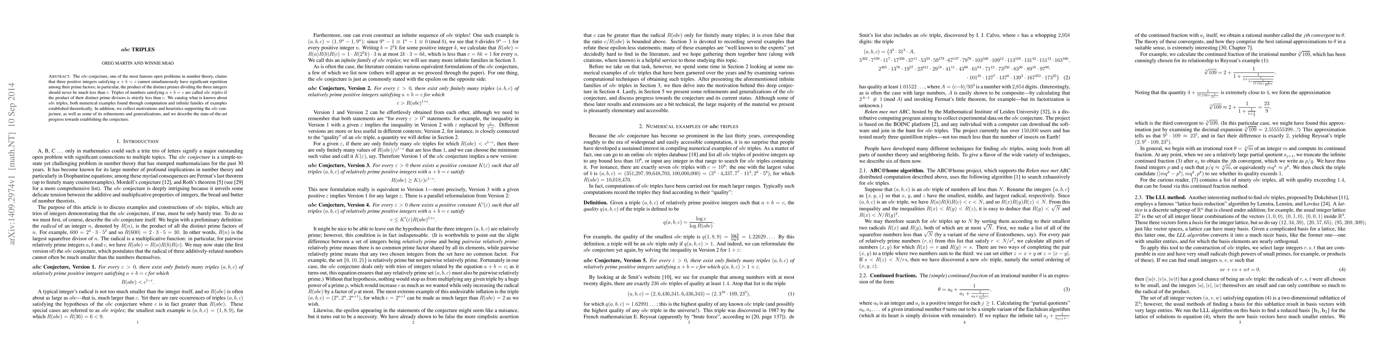 The abc conjecture, one of the most famous open problems in number theory, claims that three positive integers satisfying a+b=c cannot simultaneously have significant repetition among their prime factors; in particular, the product of the distinct primes dividing the three integers should never be much less than c. Triples of numbers satisfying a+b=c are called abc triples if the product of their distinct prime divisors is strictly less than c. We catalog what is known about abc triples, both numerical examples found through computation and infinite familes of examples established theoretically. In addition, we collect motivations and heuristics supporting the $abc$ conjecture, as well as some of its refinements and generalizations, and we describe the state-of-the-art progress towards establishing the conjecture.