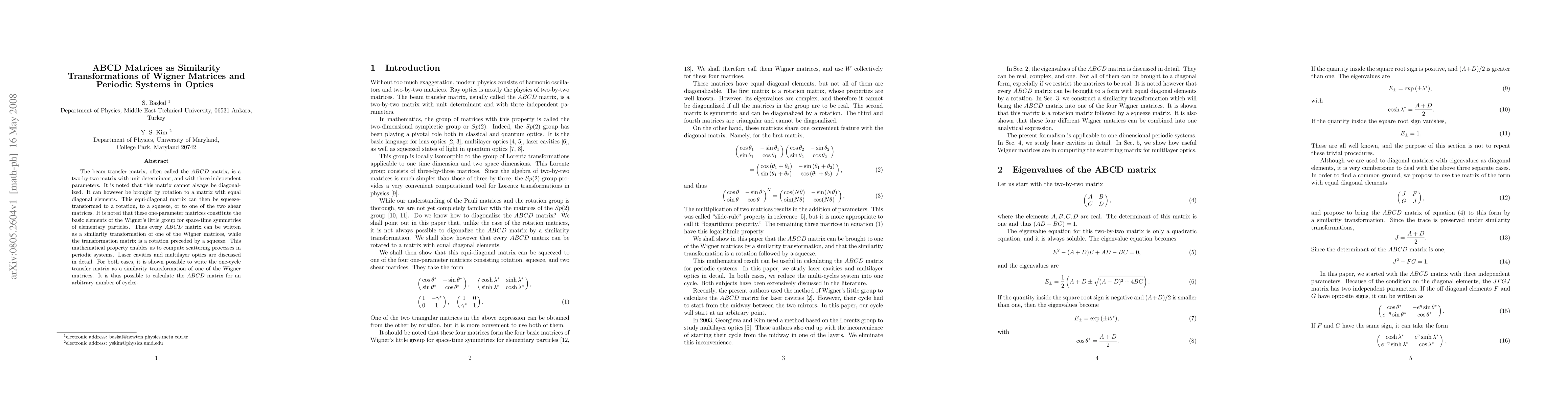 The beam transfer matrix, often called the $ABCD$ matrix, is a two-by-two matrix with unit determinant, and with three independent parameters. It is noted that this matrix cannot always be diagonalized. It can however be brought by rotation to a matrix with equal diagonal elements. This equi-diagonal matrix can then be squeeze-transformed to a rotation, to a squeeze, or to one of the two shear matrices. It is noted that these one-parameter matrices constitute the basic elements of the Wigner's little group for space-time symmetries of elementary particles. Thus every $ABCD$ matrix can be written as a similarity transformation of one of the Wigner matrices, while the transformation matrix is a rotation preceded by a squeeze. This mathematical property enables us to compute scattering processes in periodic systems. Laser cavities and multilayer optics are discussed in detail. For both cases, it is shown possible to write the one-cycle transfer matrix as a similarity transformation of one of the Wigner matrices. It is thus possible to calculate the $ABCD$ matrix for an arbitrary number of cycles.