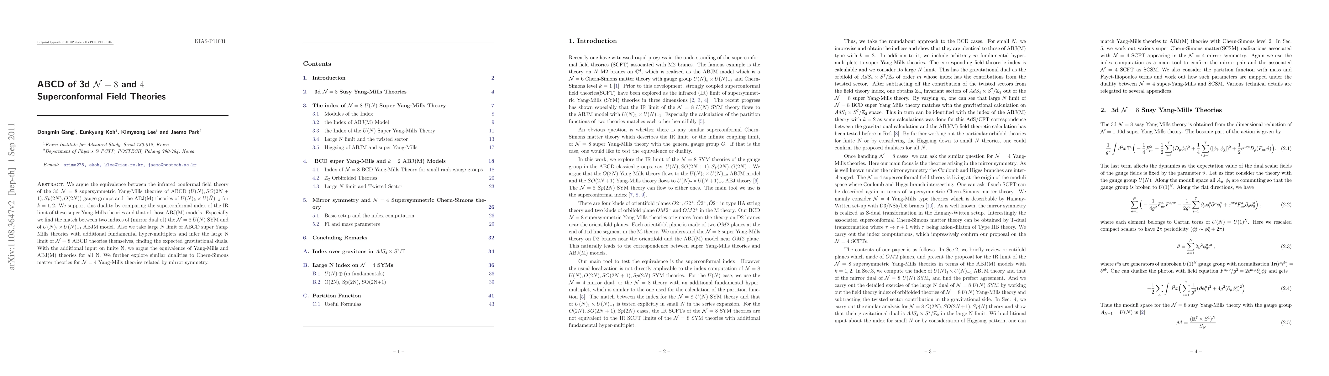 Researchers demonstrate equivalence between 3D supersymmetric Yang-Mills theories and ABJ(M) models, supporting a duality between them through superconformal indices and large N limit analysis.