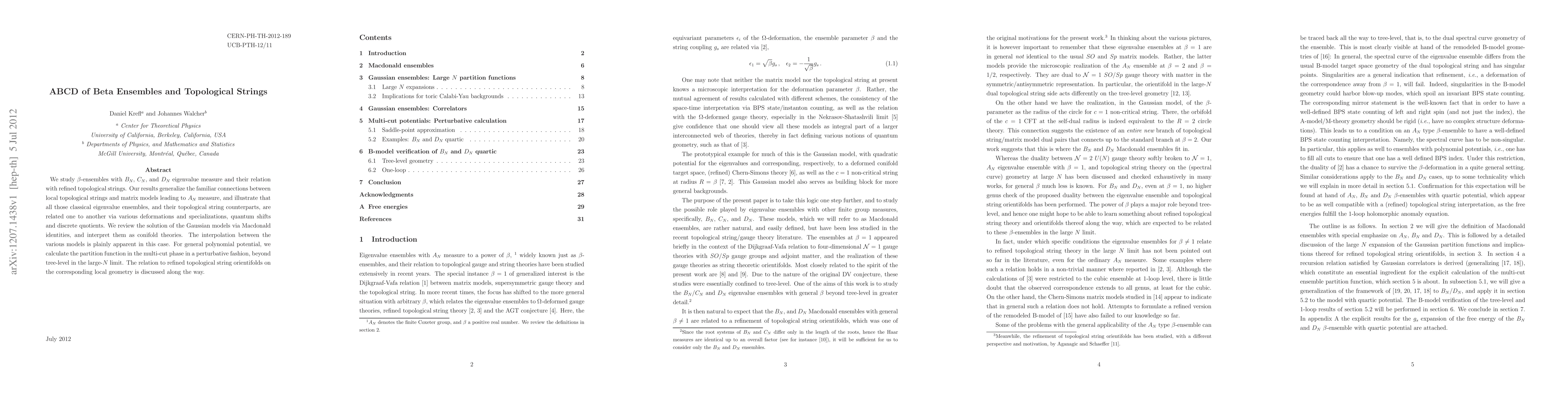 This paper explores the connections between beta-ensembles (Bn, Cn, Dn) and refined topological strings, generalizing previous links between An measures and matrix models. It employs Macdonald identities to solve Gaussian models, interprets them as conifold theories, and calculates partition functions in the multi-cut phase beyond tree-level, relating these findings to refined topological string orientifolds.