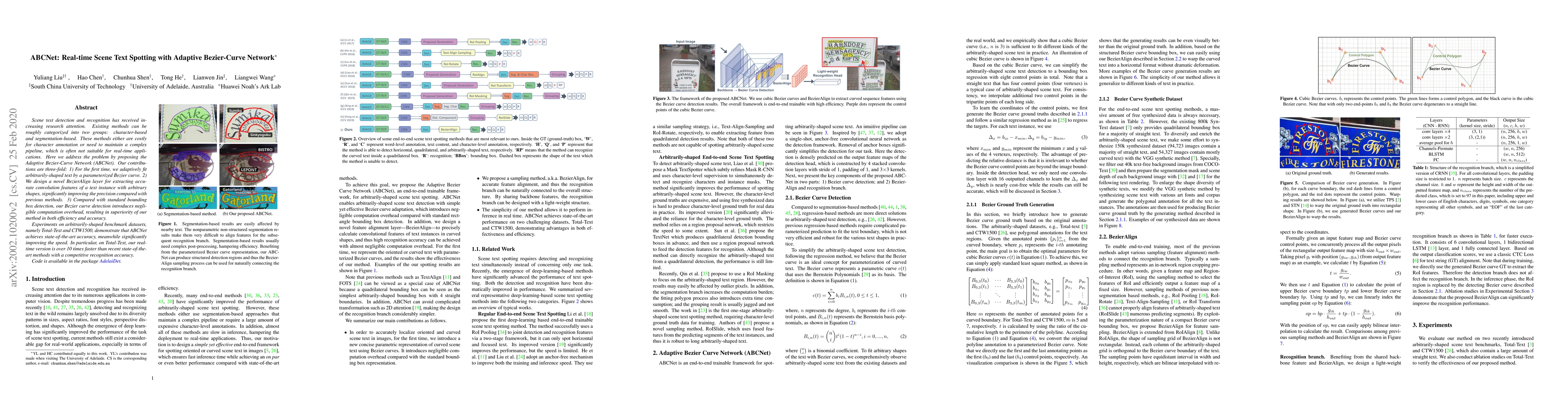 The ABCNet proposes an Adaptive Bezier-Curve Network for real-time scene text spotting, utilizing parameterized Bezier curves to fit arbitrarily-shaped text. It introduces a BezierAlign layer for precise feature extraction, achieving state-of-the-art accuracy and significantly improved speed on benchmark datasets.