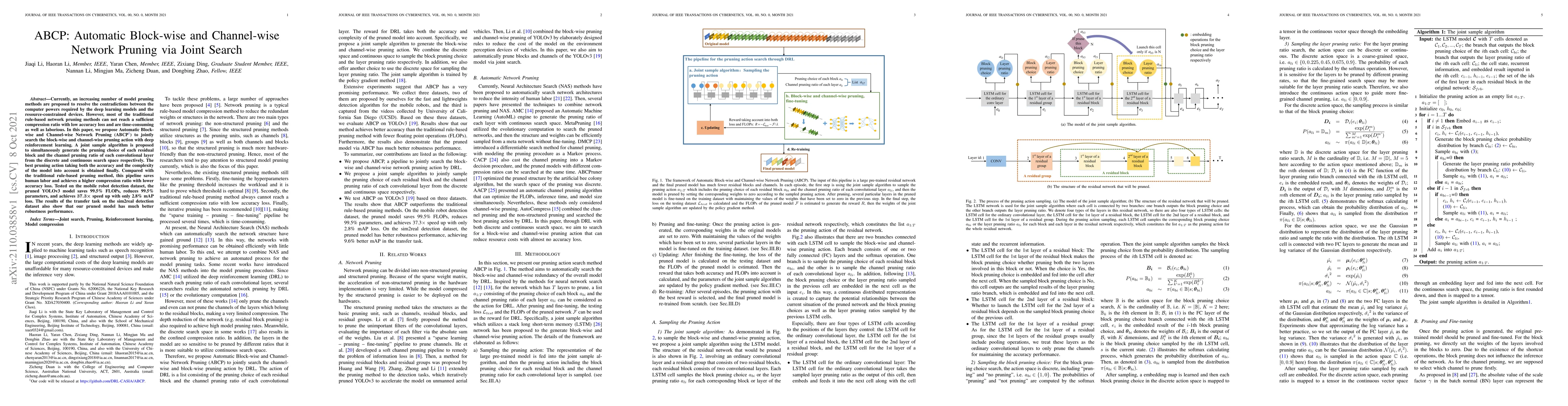 This paper proposes ABCP, an automatic network pruning method using deep reinforcement learning to jointly search for block-wise and channel-wise pruning actions. The method achieves higher compression ratios with lower accuracy loss compared to traditional rule-based methods, demonstrated by a 99.5% reduction in FLOPs and parameters for a pruned YOLOv3 model with minimal loss in detection accuracy.
