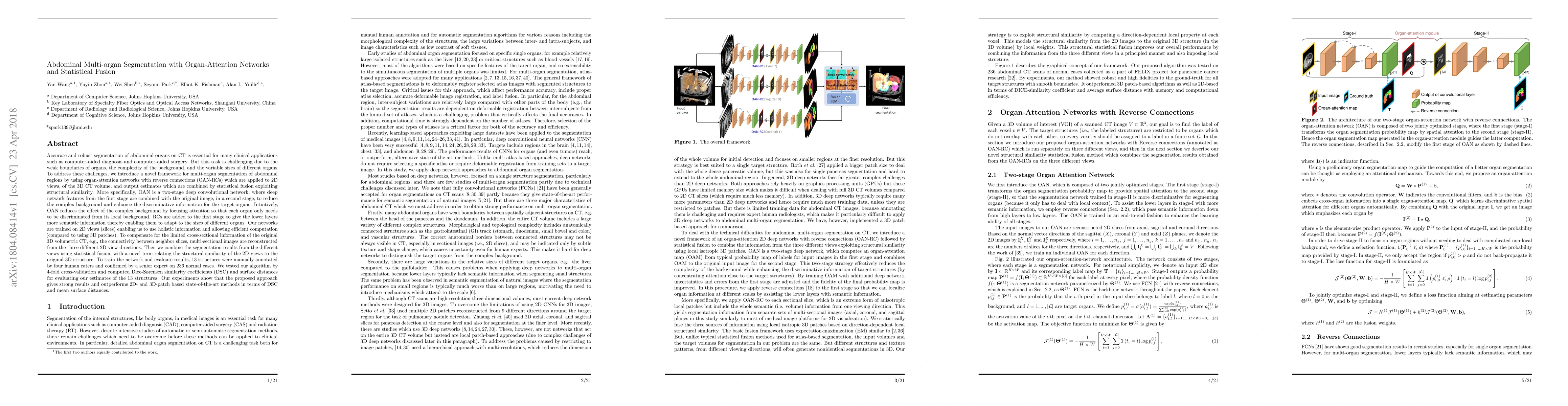 This paper introduces a novel framework for abdominal multi-organ segmentation using organ-attention networks with reverse connections and statistical fusion, achieving better results than state-of-the-art methods. The approach combines 2D view-based segmentation and multi-sectional reconstruction for enhanced accuracy.