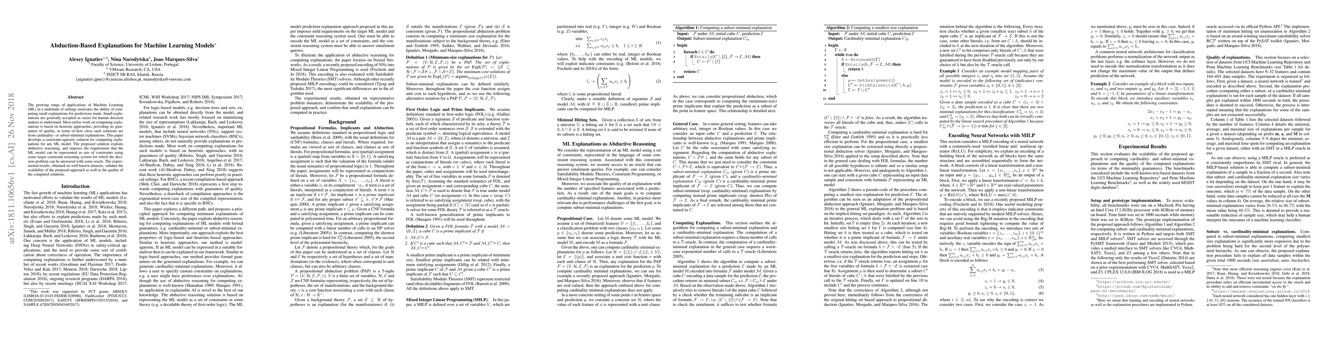 The growing range of applications of Machine Learning (ML) in a multitude of settings motivates the ability of computing small explanations for predictions made. Small explanations are generally accepted as easier for human decision makers to understand. Most earlier work on computing explanations is based on heuristic approaches, providing no guarantees of quality, in terms of how close such solutions are from cardinality- or subset-minimal explanations. This paper develops a constraint-agnostic solution for computing explanations for any ML model. The proposed solution exploits abductive reasoning, and imposes the requirement that the ML model can be represented as sets of constraints using some target constraint reasoning system for which the decision problem can be answered with some oracle. The experimental results, obtained on well-known datasets, validate the scalability of the proposed approach as well as the quality of the computed solutions.