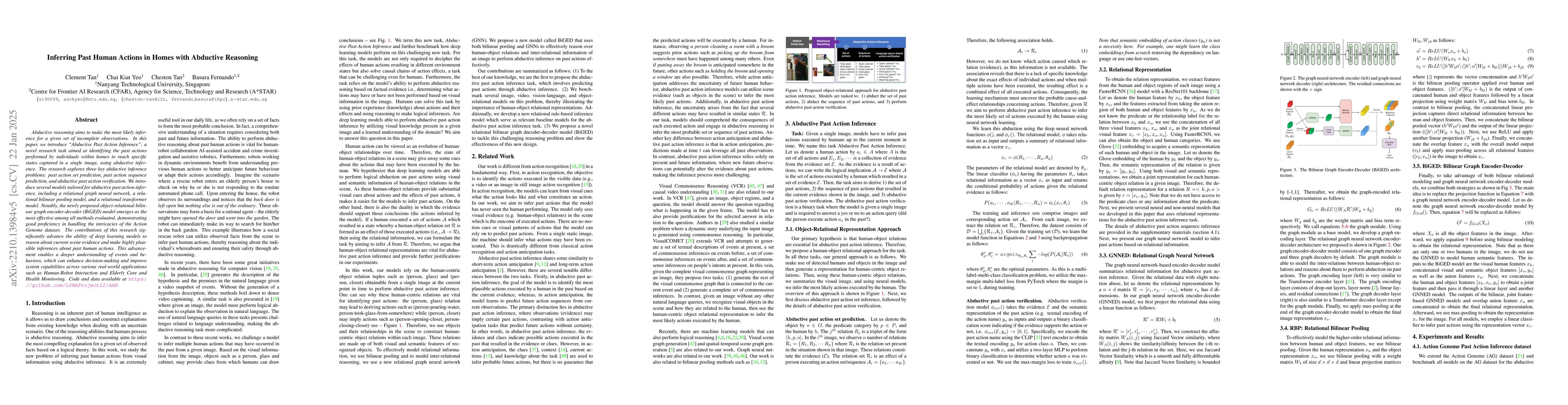 This paper introduces "abductive action inference," a task focused on determining human actions leading to specific states from single snapshots. It evaluates various models, including Transformers, Graph Neural Networks, and novel approaches like BiGED, finding the latter most effective for predicting action sets, sequences, and verifying actions.