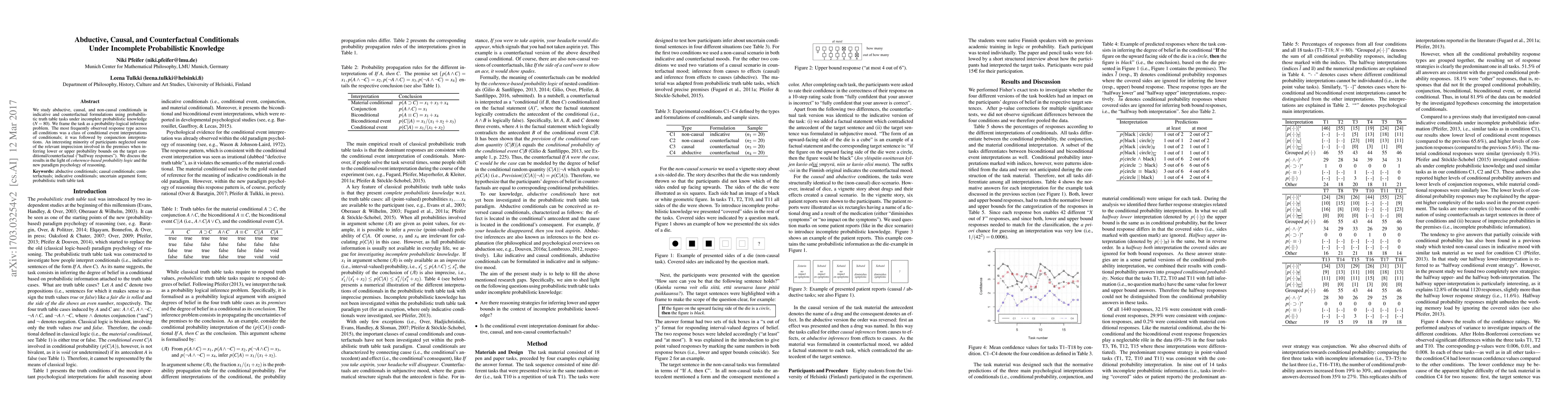 This research investigates how people interpret abductive, causal, and counterfactual conditionals under conditions of incomplete probabilistic knowledge, finding that most participants favor conditional event interpretations, while a notable minority makes "halfway responses" by ignoring premise imprecision. The study ties these findings to coherence-based probability logic and modern reasoning psychology.