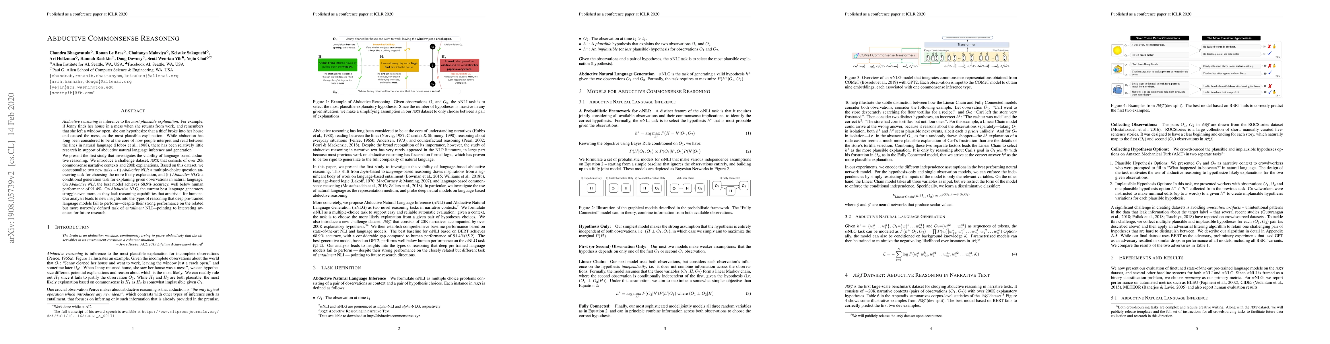This paper investigates the viability of abductive reasoning in natural language processing through two new tasks: Abductive NLI and Abductive NLG, using a new dataset ART. While models achieve 68.9% accuracy on Abductive NLI, they lag behind human performance, highlighting the gap in deep language models' reasoning capabilities compared to human commonsense understanding.