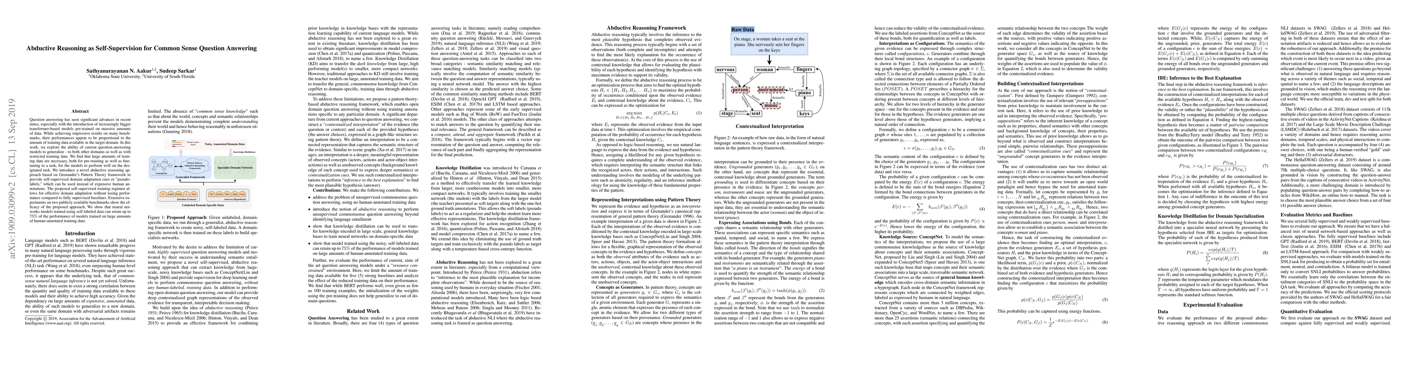 Question answering has seen significant advances in recent times, especially with the introduction of increasingly bigger transformer-based models pre-trained on massive amounts of data. While achieving impressive results on many benchmarks, their performances appear to be proportional to the amount of training data available in the target domain. In this work, we explore the ability of current question-answering models to generalize - to both other domains as well as with restricted training data. We find that large amounts of training data are necessary, both for pre-training as well as fine-tuning to a task, for the models to perform well on the designated task. We introduce a novel abductive reasoning approach based on Grenander's Pattern Theory framework to provide self-supervised domain adaptation cues or "pseudo-labels," which can be used instead of expensive human annotations. The proposed self-supervised training regimen allows for effective domain adaptation without losing performance compared to fully supervised baselines. Extensive experiments on two publicly available benchmarks show the efficacy of the proposed approach. We show that neural networks models trained using self-labeled data can retain up to $75\%$ of the performance of models trained on large amounts of human-annotated training data.