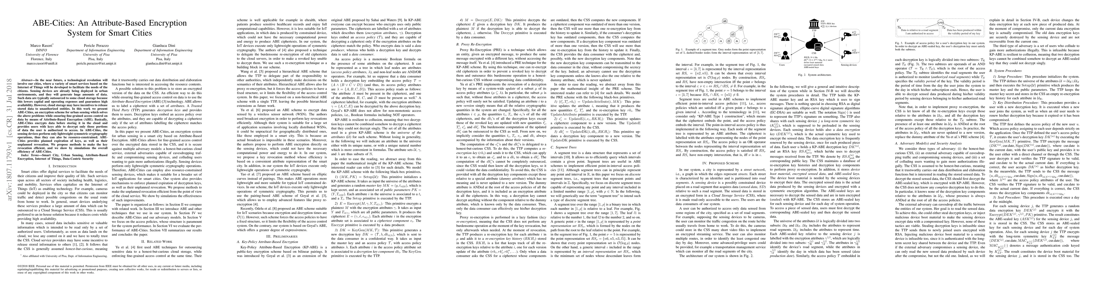 ABE-Cities is an Attribute-Based Encryption (ABE) system designed to secure data from urban IoT devices stored in the cloud, ensuring fine-grained access control and efficient key revocation. It employs lightweight symmetric cryptography on resource-constrained devices and supports both planned and unplanned key expiration.