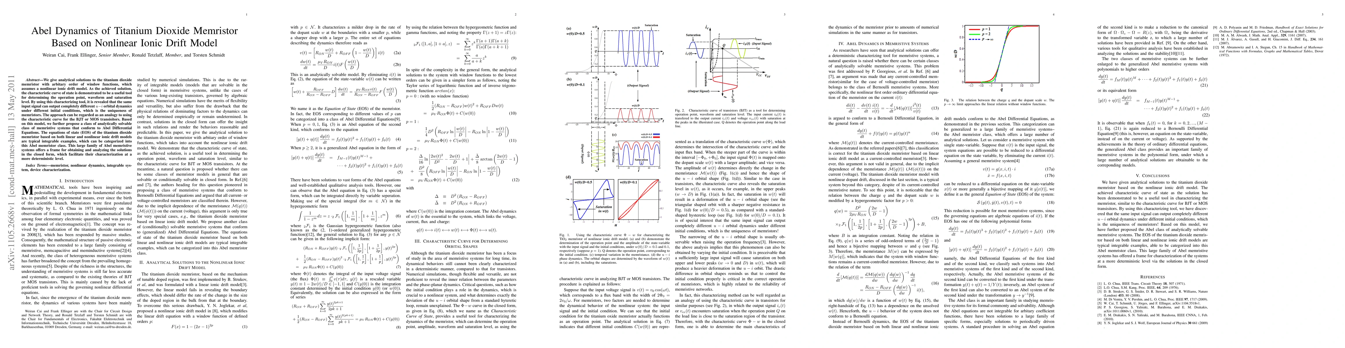 This paper provides analytical solutions for titanium dioxide memristors using a nonlinear ionic drift model, demonstrating that the characteristic curve is vital for determining operation points and waveforms. It reveals unique u-i orbital dynamics under different initial conditions and proposes a class of analytically solvable memristive systems conforming to Abel Differential Equations.