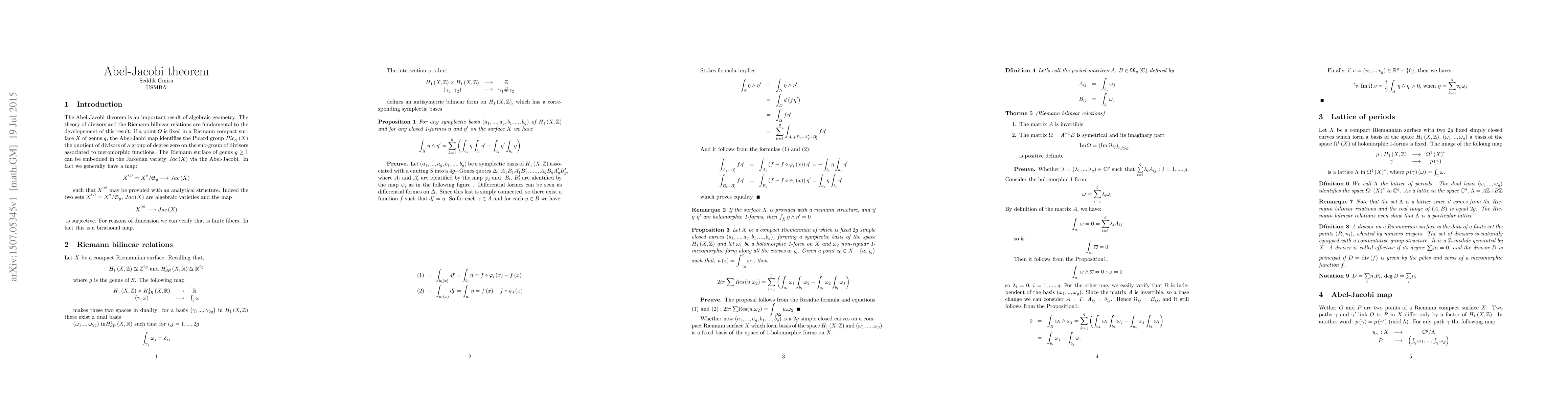 The Abel Jacobi theorem is an important result of algebraic geometry. The theory of divisors and the Riemann bilinear relations are fundamental to the developement of this result: if a point O is fixed in a Riemann compact surface X of genus g, the Abel Jaobi map identifies the Picard group: the quotient of divisors of a group of degree zero by the sub-group of divisors associated to meromorphic functions. The Riemann surface of genus g can be embedded in the Jacobian variety via the Abel-Jacobi. In fact, generally.the surface may be provided with an analytical structure.or algebraic varietie.