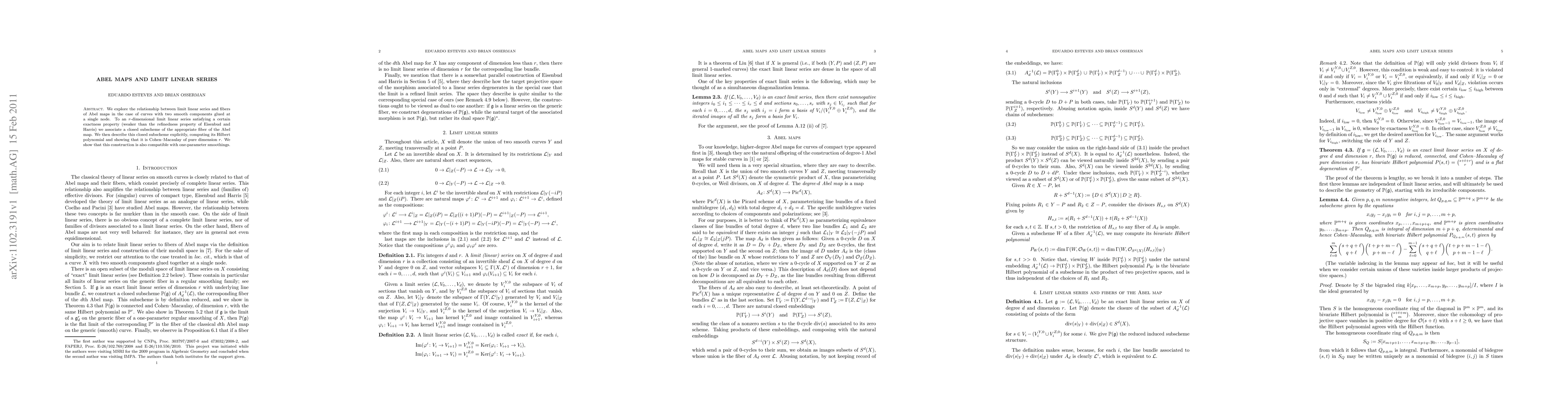 We explore the relationship between limit linear series and fibers of Abel maps in the case of curves with two smooth components glued at a single node. To an r-dimensional limit linear series satisfying a certain exactness property (weaker than the refinedness property of Eisenbud and Harris) we associate a closed subscheme of the appropriate fiber of the Abel map. We then describe this closed subscheme explicitly, computing its Hilbert polynomial and showing that it is Cohen-Macaulay of pure dimension r. We show that this construction is also compatible with one-parameter smoothings.