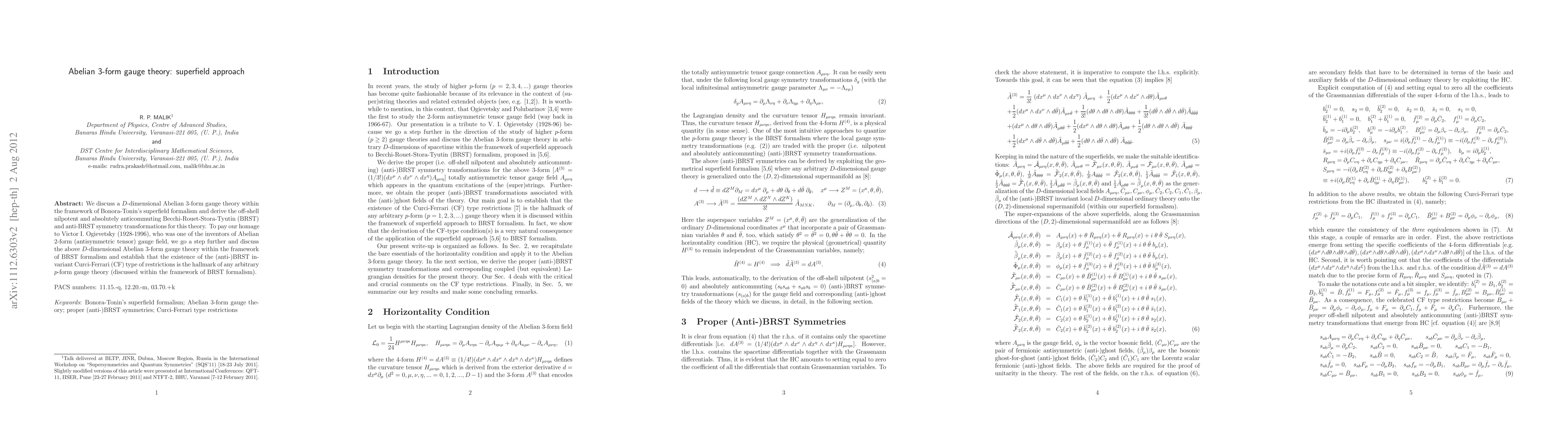 We discuss a D-dimensional Abelian 3-form gauge theory within the framework of Bonora-Tonin's superfield formalism and derive the off-shell nilpotent and absolutely anticommuting Becchi-Rouet-Stora-Tyutin (BRST) and anti-BRST symmetry transformations for this theory. To pay our homage to Victor I. Ogievetsky (1928-1996), who was one of the inventors of Abelian 2-form (antisymmetric tensor) gauge field, we go a step further and discuss the above D-dimensional Abelian 3-form gauge theory within the framework of BRST formalism and establish that the existence of the (anti-)BRST invariant Curci-Ferrari (CF) type of restrictions is the hallmark of any arbitrary p-form gauge theory (discussed within the framework of BRST formalism).