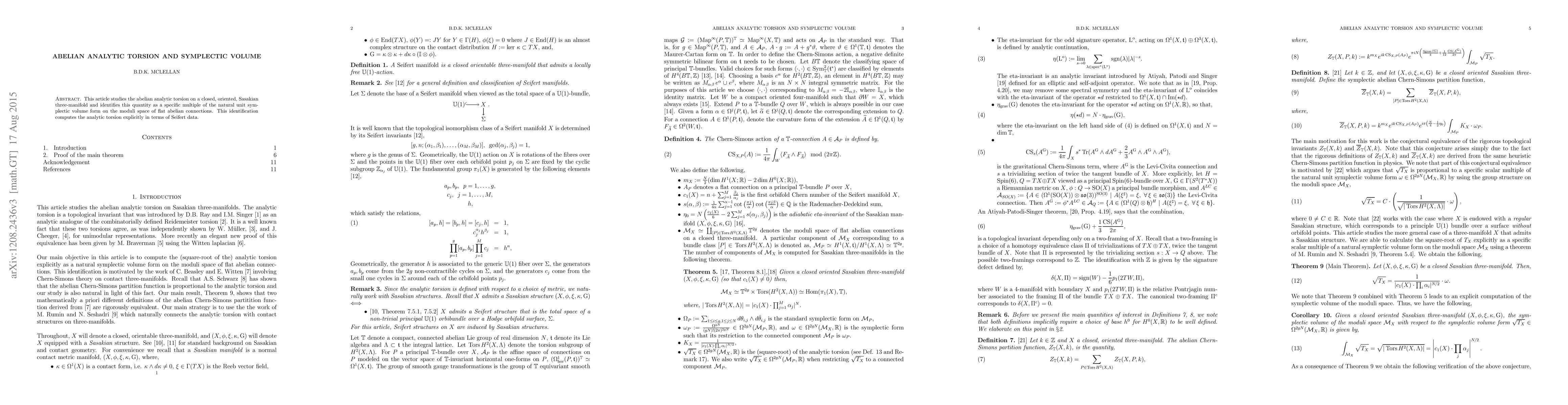 This paper links abelian analytic torsion on a closed, oriented, Sasakian three-manifold to the symplectic volume form on the moduli space of flat abelian connections, expressing the former in terms of Seifert data. The result provides an explicit computation of the analytic torsion.