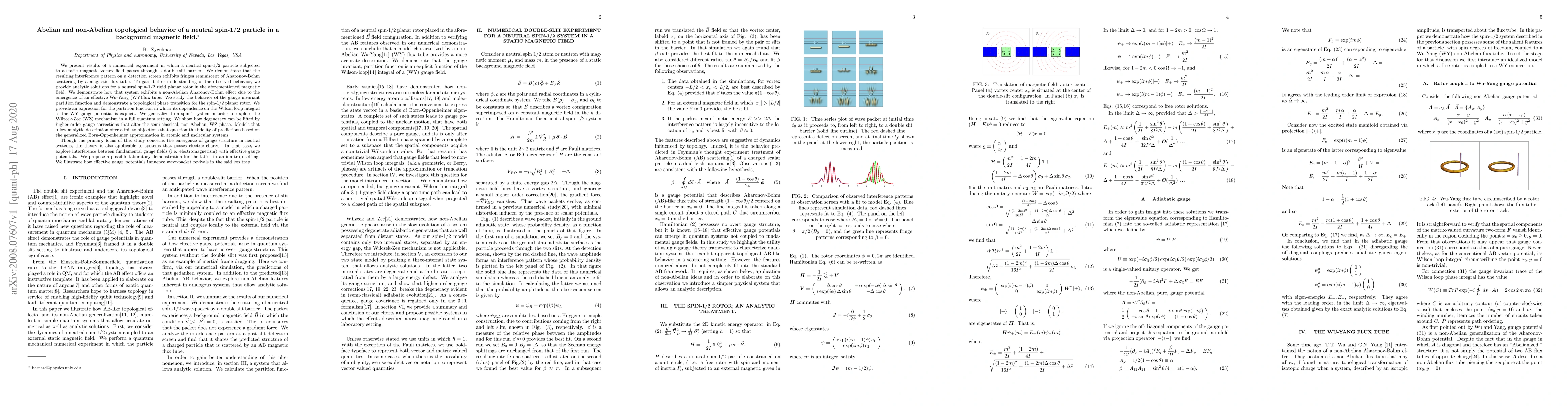 We present results of a numerical experiment in which a neutral spin-1/2 particle subjected to a static magnetic vortex field passes through a double-slit barrier. We demonstrate that the resulting interference pattern on a detection screen exhibits fringes reminiscent of Aharonov-Bohm scattering by a magnetic flux tube. To gain better understanding of the observed behavior, we provide analytic solutions for a neutral spin-1/2 rigid planar rotor in the aforementioned magnetic field. We demonstrate how that system exhibits a non-Abelian Aharonov-Bohm effect due to the emergence of an effective Wu-Yang (WY)flux tube. We study the behavior of the gauge invariant partition function and demonstrate a topological phase transition for the spin-1/2 planar rotor. We provide an expression for the partition function in which its dependence on the Wilson loop integral of the WY gauge potential is explicit. We generalize to a spin-1 system in order to explore the Wilzcek-Zee (WZ) mechanism in a full quantum setting. We show how degeneracy can be lifted by higher order gauge corrections that alter the semi-classical, non-Abelian, WZ phase. Models that allow analytic description offer a foil to objections that question the fidelity of predictions based on the generalized Born-Oppenheimer approximation in atomic and molecular systems. Though the primary focus of this study concerns the emergence of gauge structure in neutral systems, the theory is also applicable to systems that posses electric charge. In that case, we explore interference between fundamental gauge fields (i.e. electromagnetism) with effective gauge potentials. We propose a possible laboratory demonstration for the latter in an ion trap setting. We illustrate how effective gauge potentials influence wave-packet revivals in the said ion trap.
