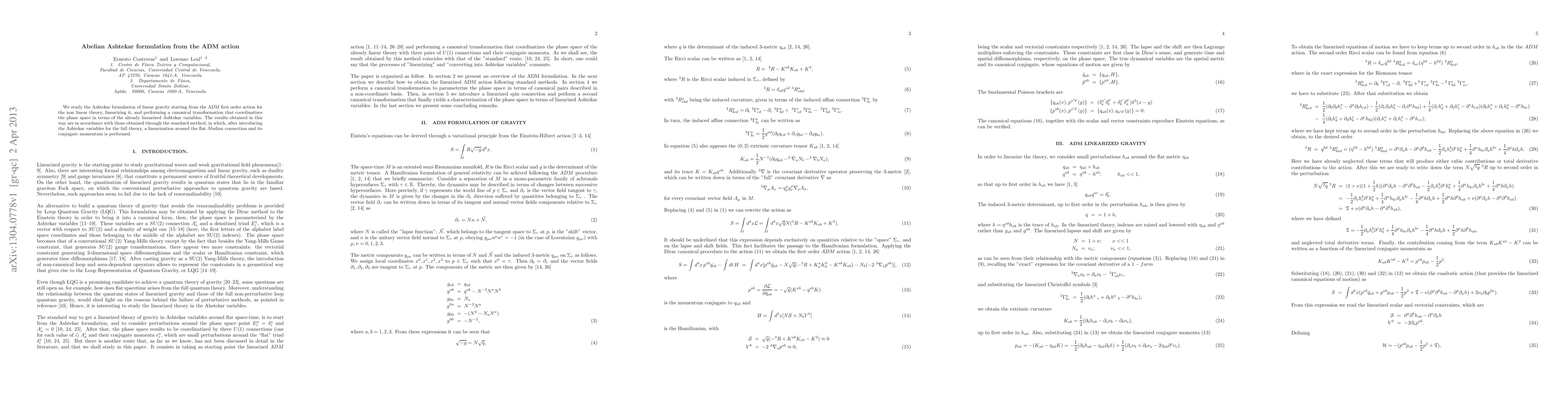 This paper explores the Abelian Ashtekar formulation of linear gravity by linearizing the ADM first-order action and performing a canonical transformation to match the Ashtekar variables. The results align with those derived from the standard method involving linearization around an Abelian connection.
